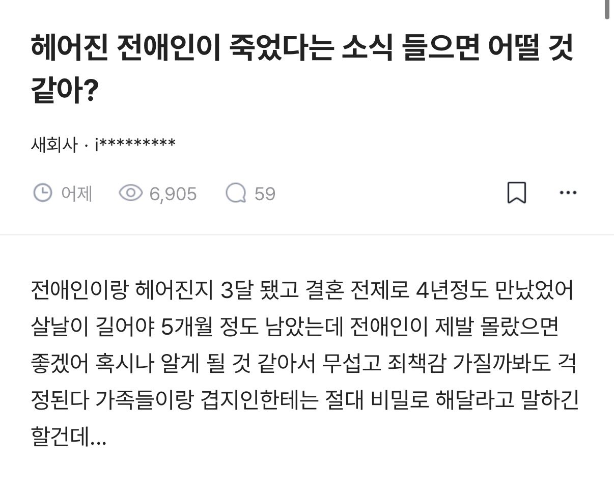 [흥미돋]헤어진 전애인이 죽었다는 소식 들으면 어떨 것 같아? 작성자(본인 닉네임)))|작성시간26.02.24|조회수56,373 목록 댓글 320 글자크기 작게가 글자크기 크게가 출처: https://x.com/kookoo_Nick/status/2026090013449167112?t=I5oYBVlKb-8-963nbiNNqQ&s=19X의 쿠쿠님(@kookoo_Nick)헤어진 전애인이 죽었다는 소식 들으면 어떨것같아❔ 살 날이 5개월 남은 글쓴이……x.com엄청 심란하긴 할듯... 다음검색 현재 게시글 추가 기능 열기 북마크 공유하기 신고 센터로 신고 댓글 댓글 320 댓글쓰기 답글쓰기 댓글 리스트 작성자나폴리탄스파게티 | 작성시간 26.02.25 삼각고인돌에면봉을비빔🤭🩷 작성자하이그레그레 | 작성시간 26.02.25 갓군아 작성자하좃뺑이타임시작 | 작성시간 26.02.26 잘죽 ㅋ 작성자밤밤부 | 작성시간 26.02.27 좀있으면 애 태어나던데ㅠ 우짜노 이런생각은 들듯 작성자고기사랑 | 작성시간 26.02.28 아하 댓글 전체보기