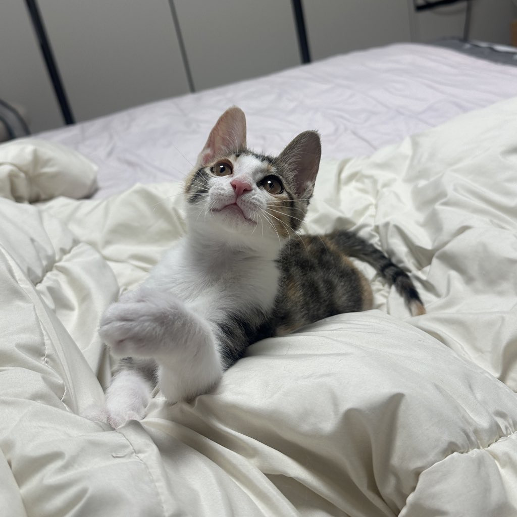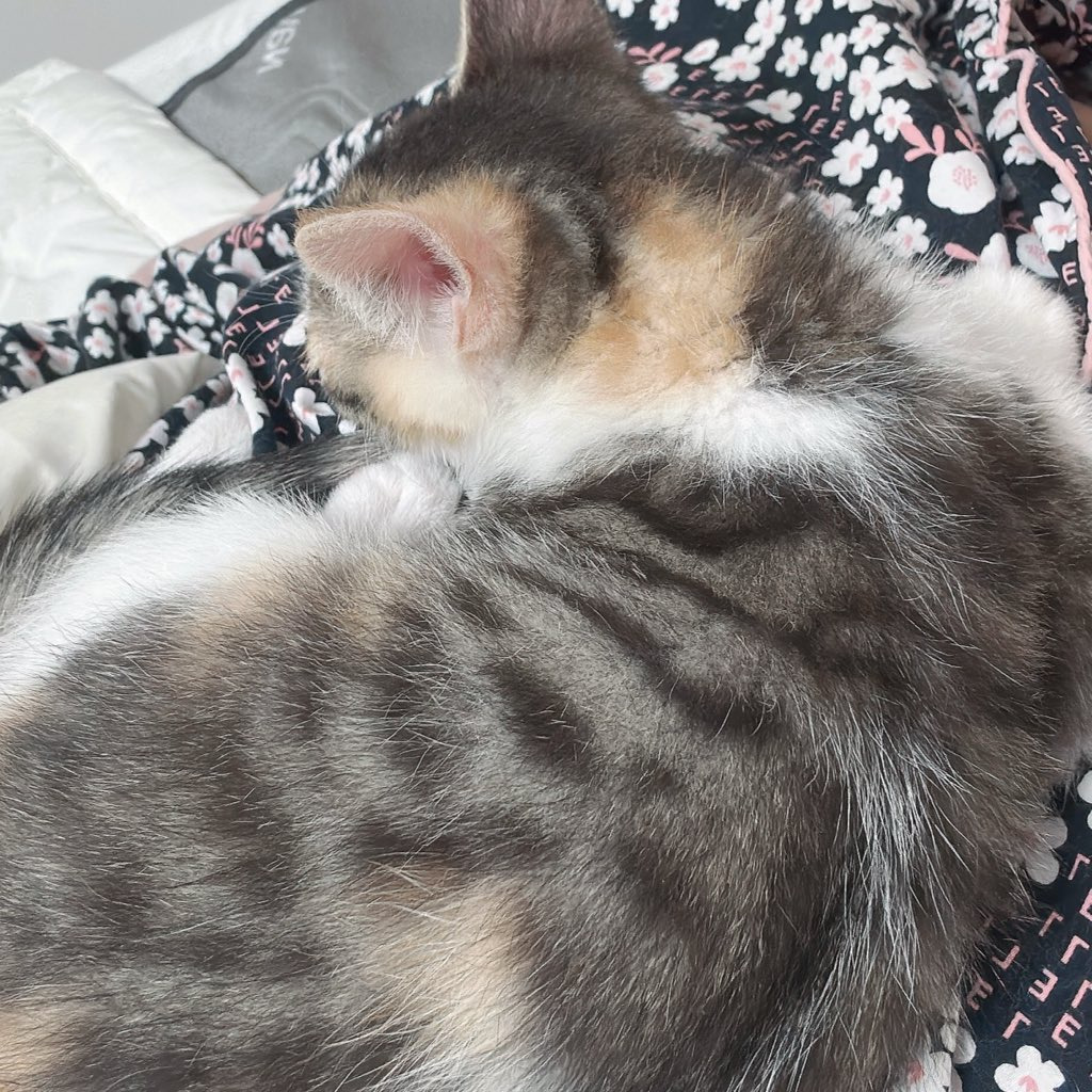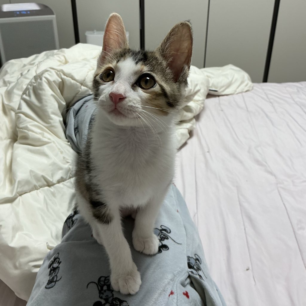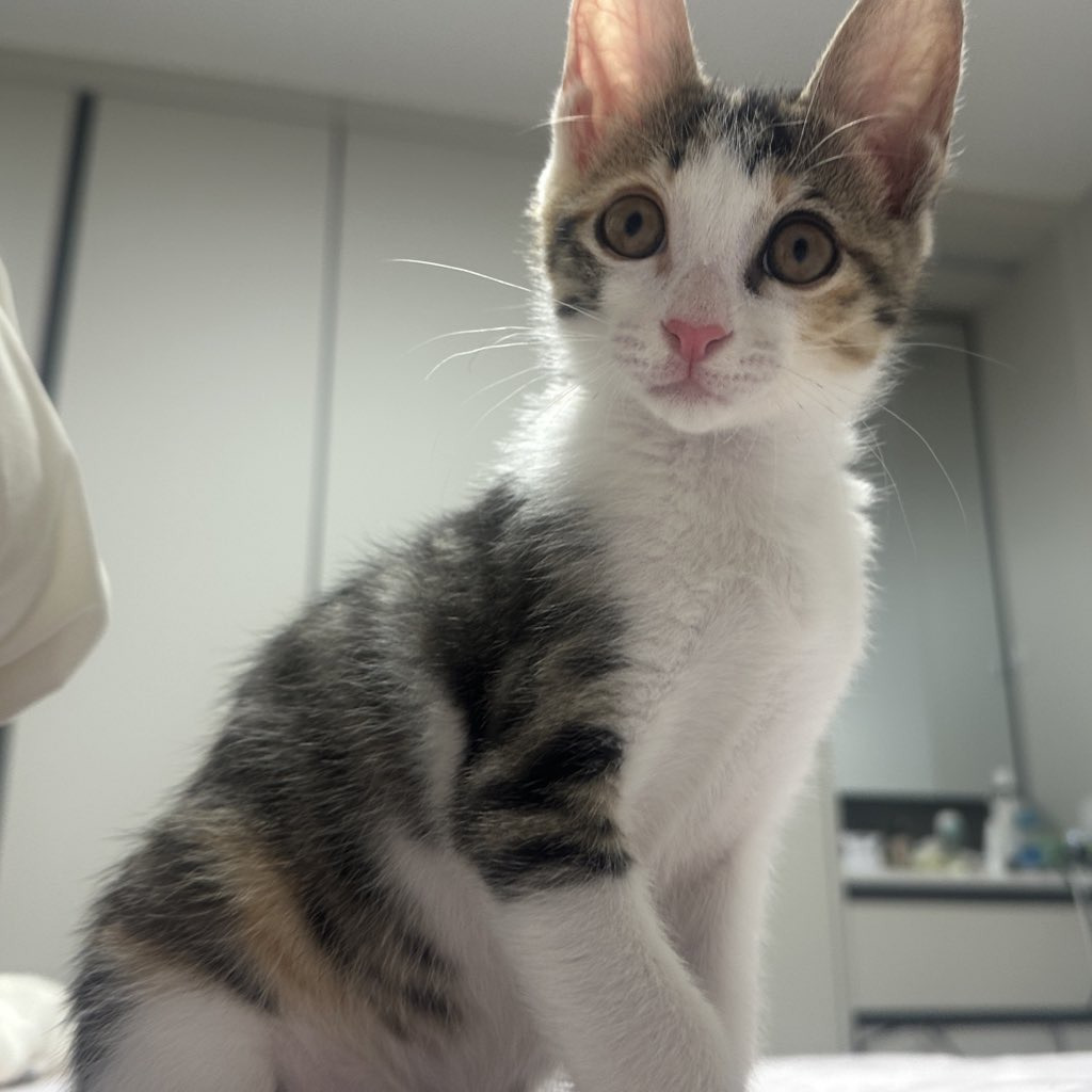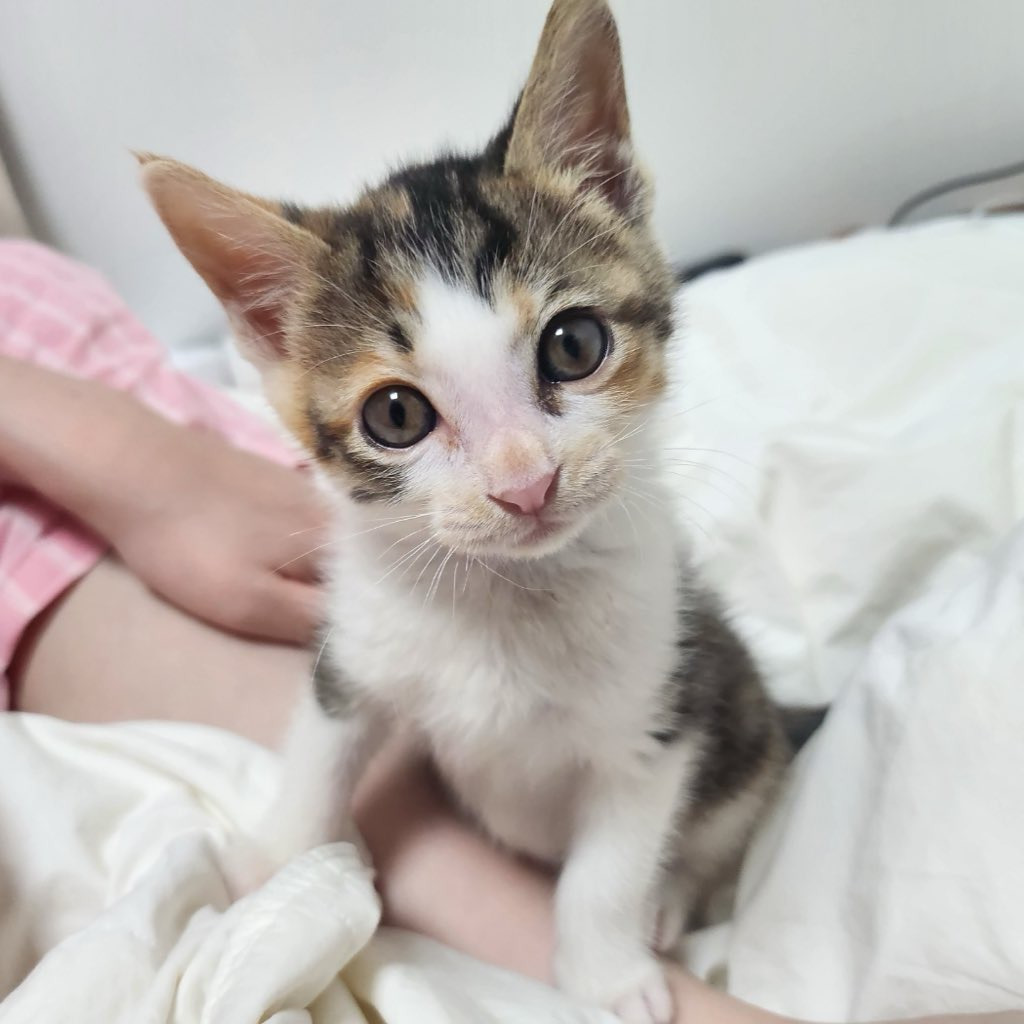 구조 이야기 : 생후 2주차에 중학교 화단 구석에 형제냥이 1마리랑 같이 있었음. 학생들이 만져대고, 돌을 던지기도 해서 어미냥이가 올 때까지 기다렸다가 안와서 구조. (물론 곁에서 다치지 않도록 지켜준 학생들도 있음!)