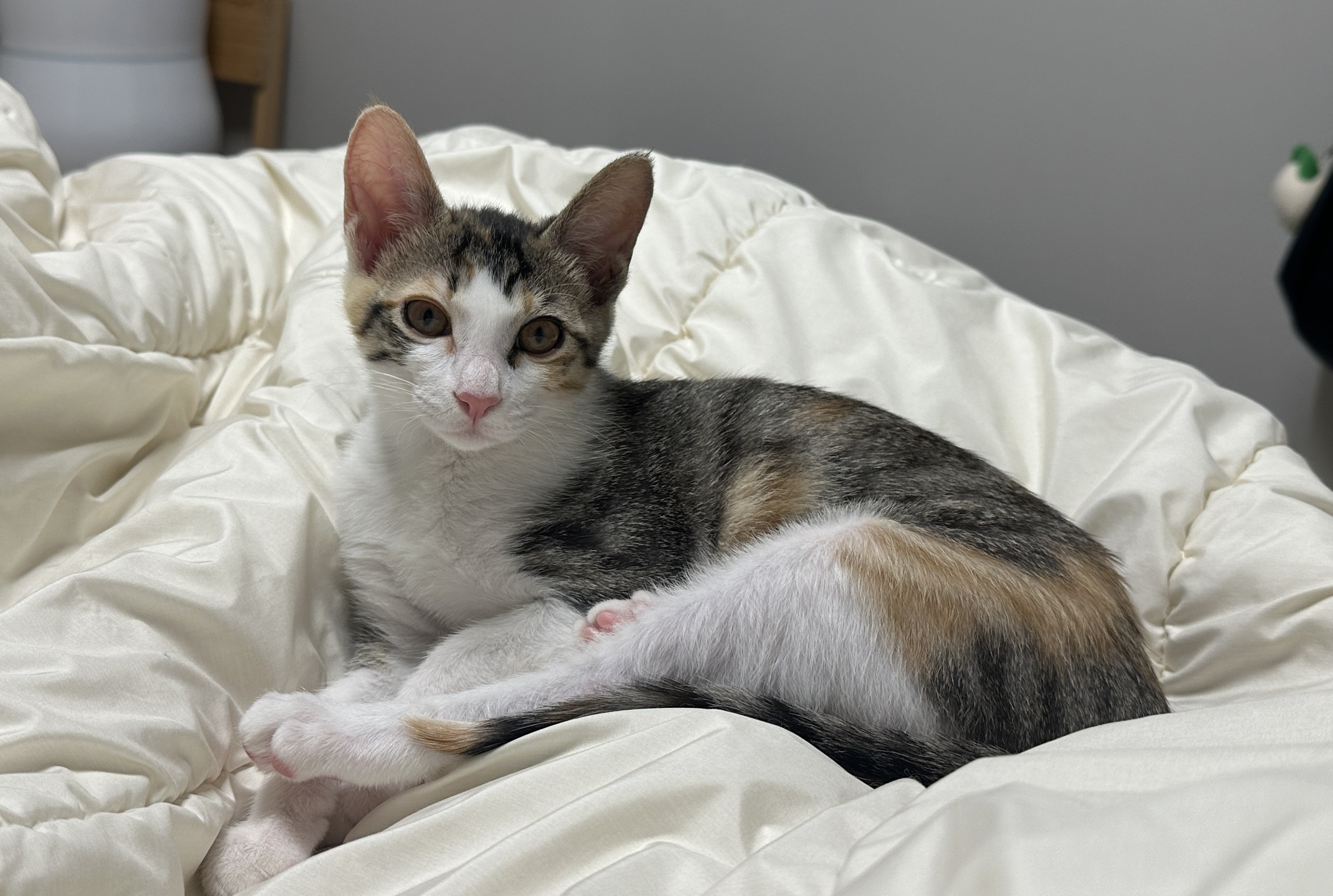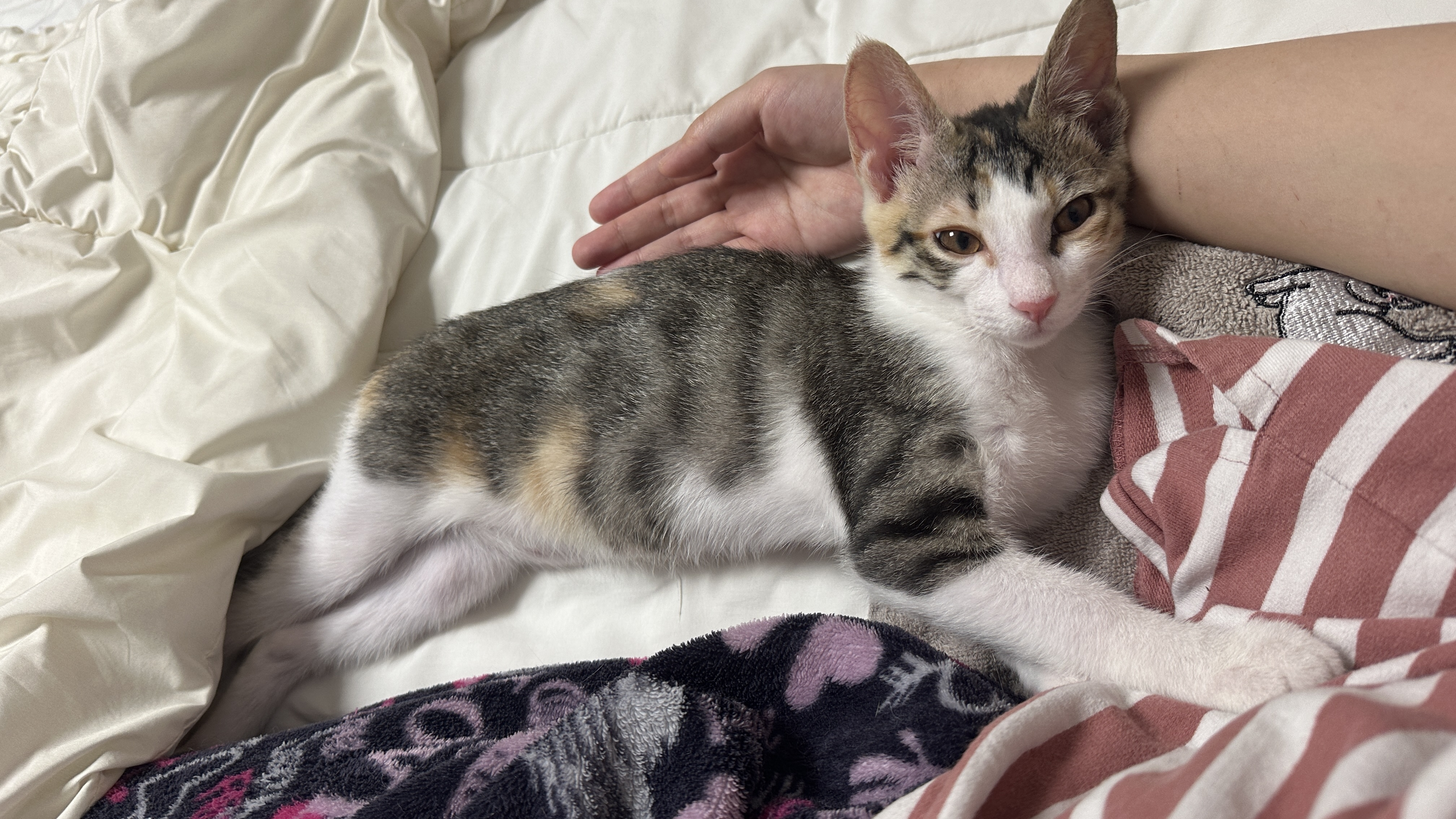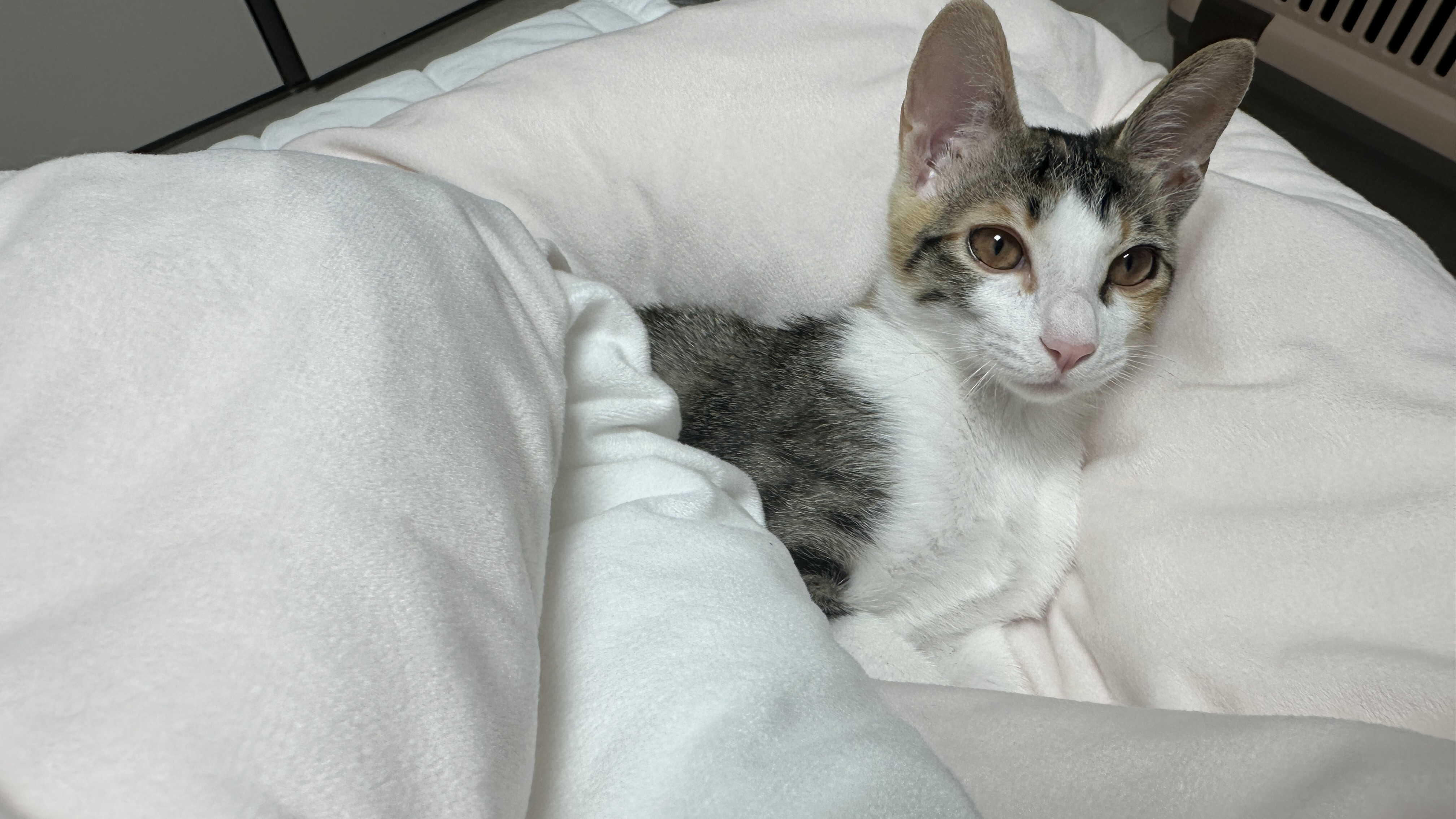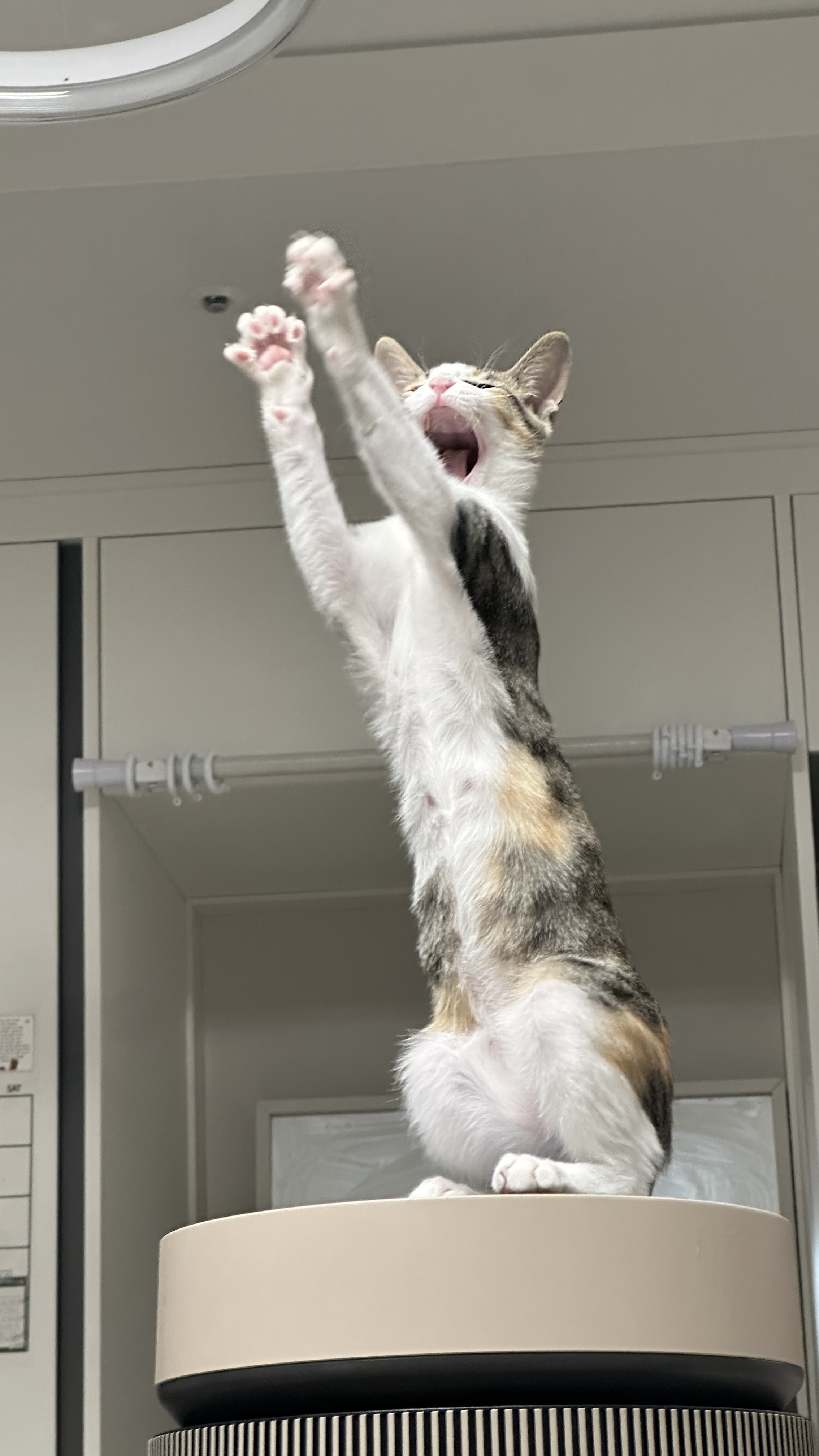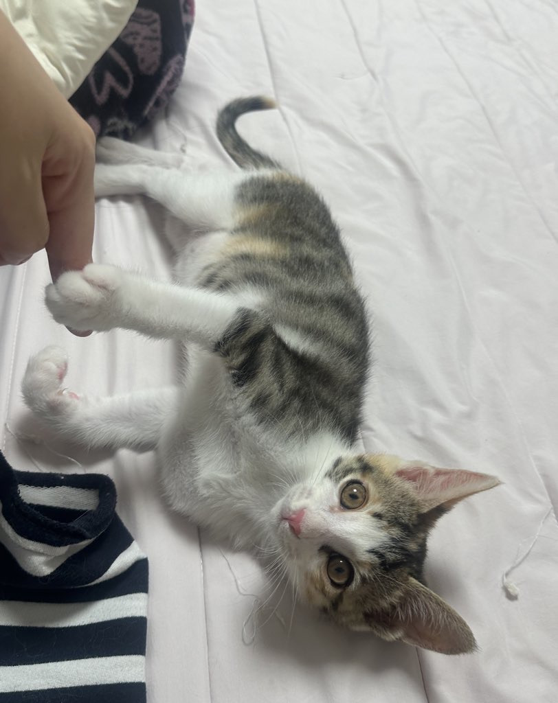 구조 이야기 : 생후 2주차에 중학교 화단 구석에 형제냥이 1마리랑 같이 있었음. 학생들이 만져대고, 돌을 던지기도 해서 어미냥이가 올 때까지 기다렸다가 안와서 구조. (물론 곁에서 다치지 않도록 지켜준 학생들도 있음!)