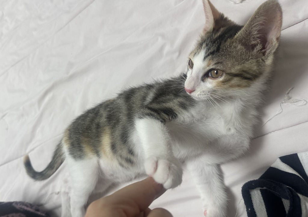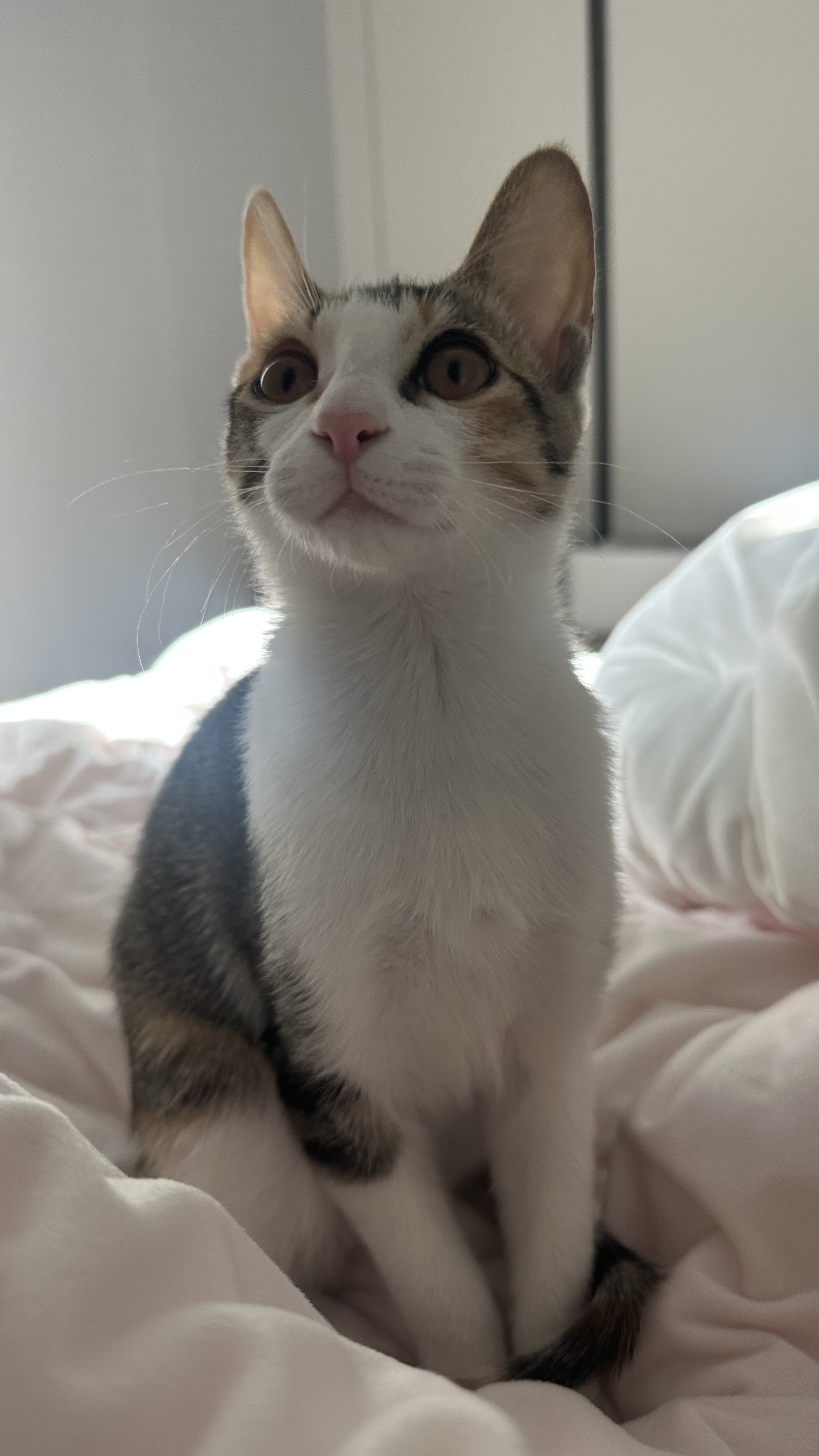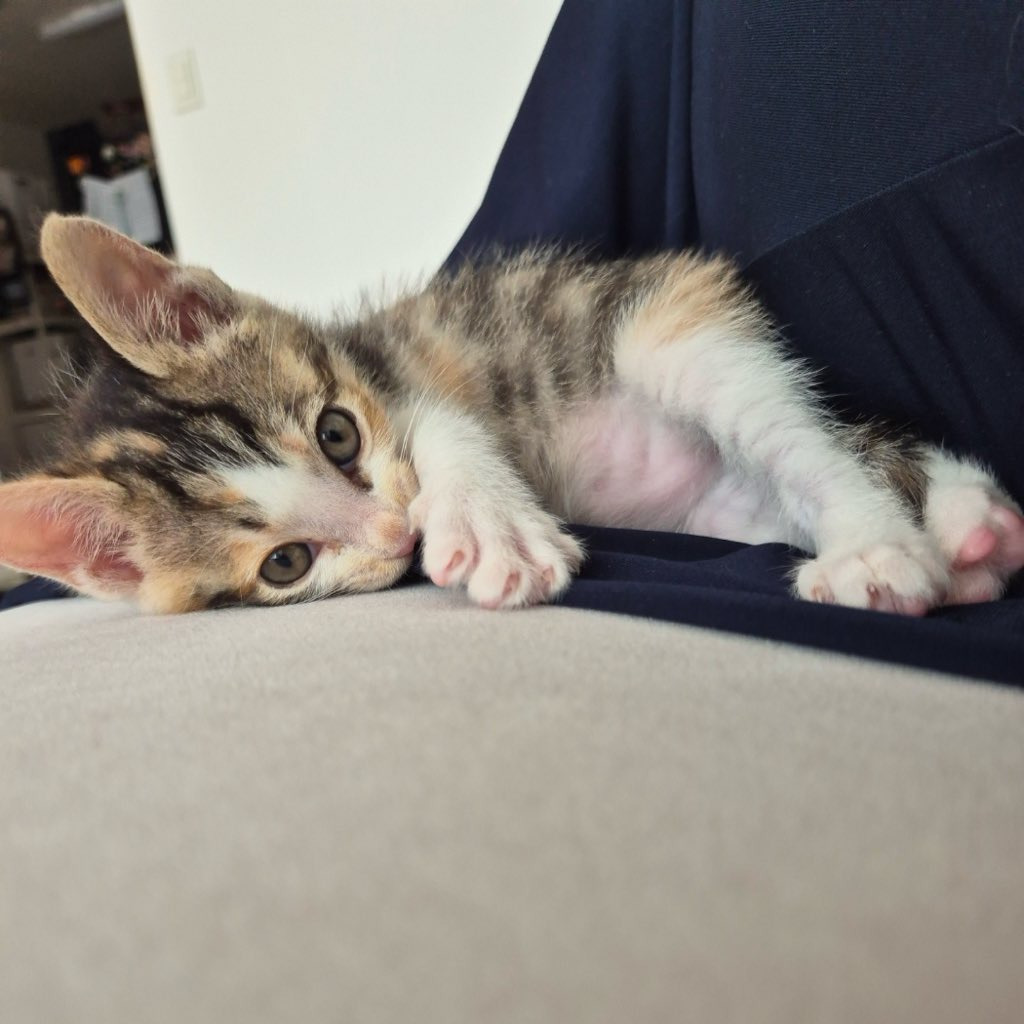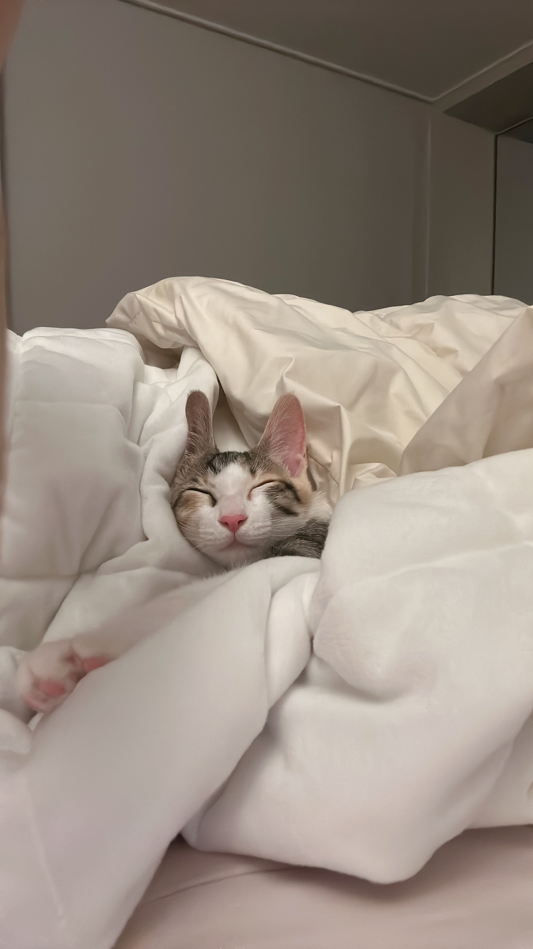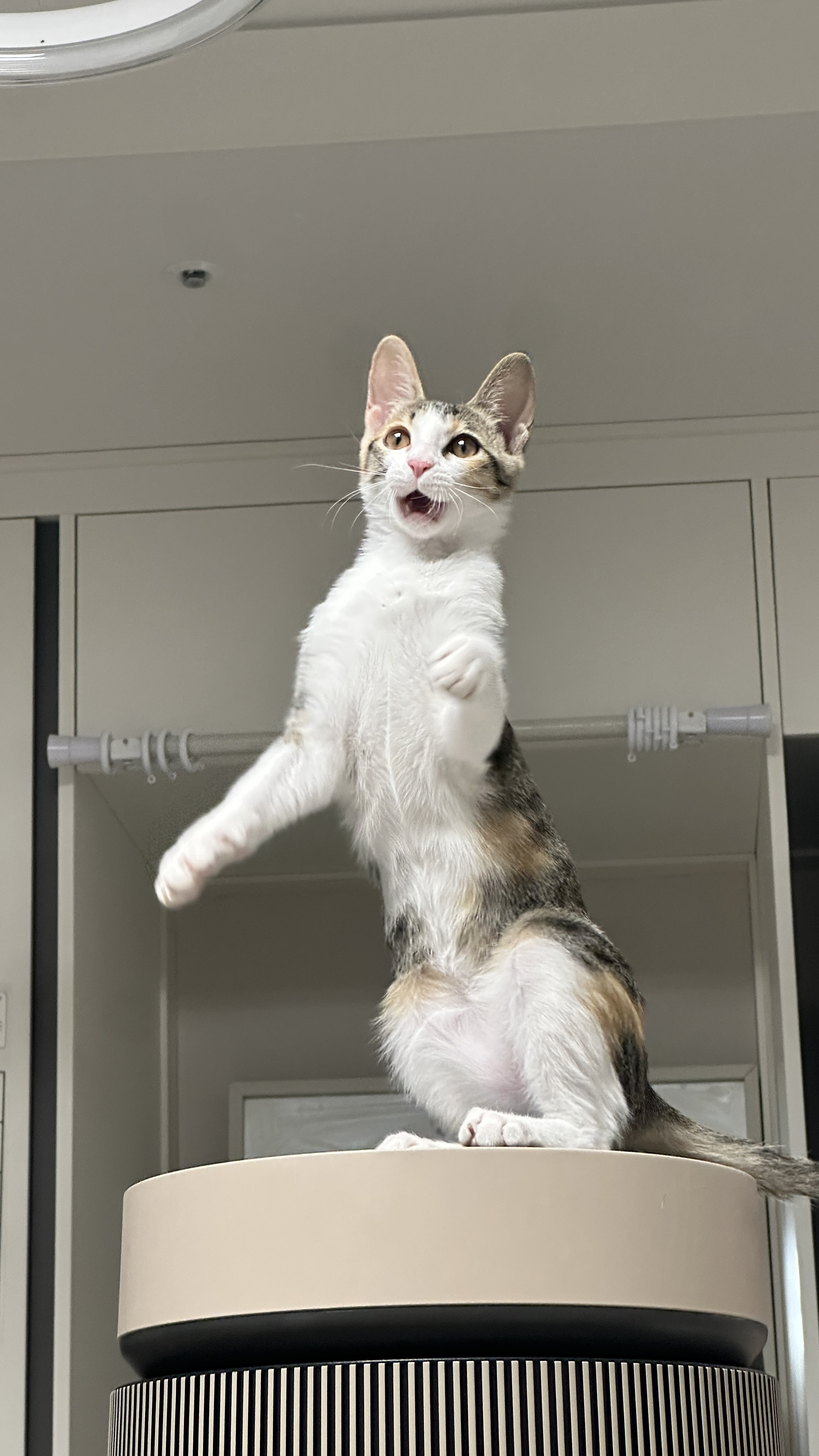 구조 이야기 : 생후 2주차에 중학교 화단 구석에 형제냥이 1마리랑 같이 있었음. 학생들이 만져대고, 돌을 던지기도 해서 어미냥이가 올 때까지 기다렸다가 안와서 구조. (물론 곁에서 다치지 않도록 지켜준 학생들도 있음!)
