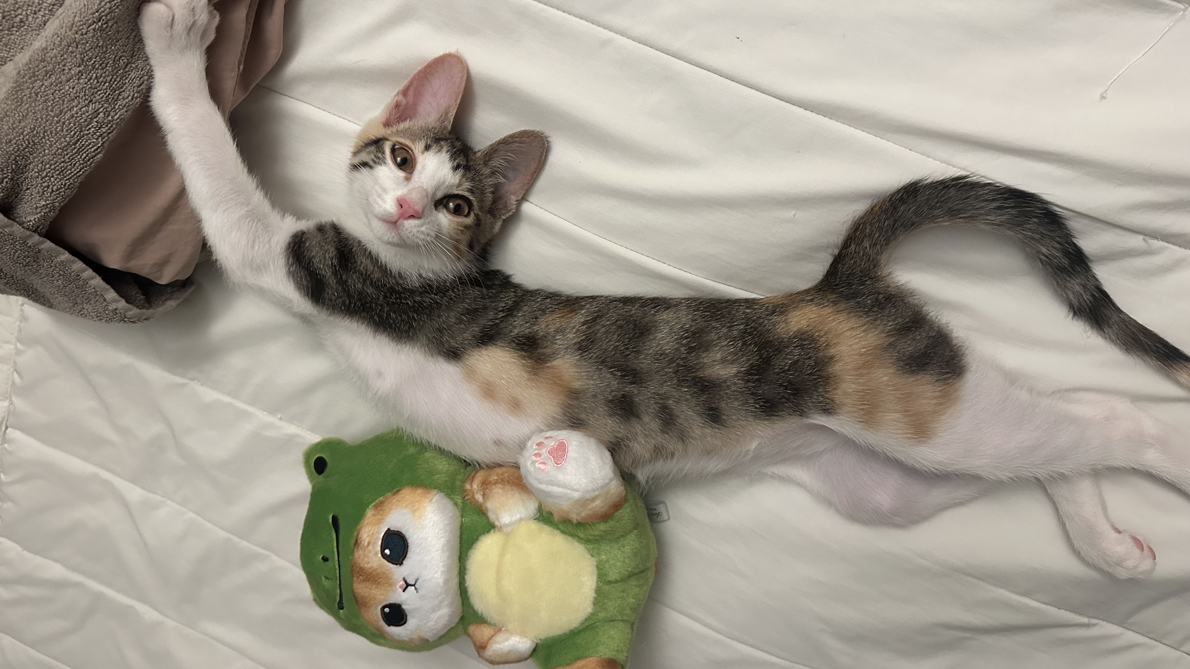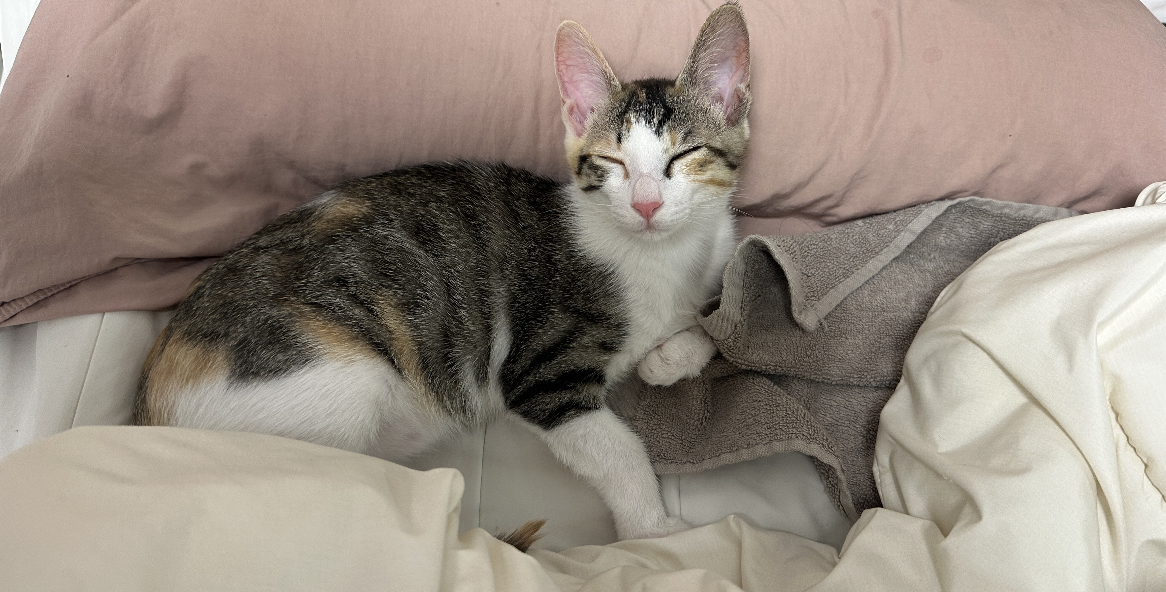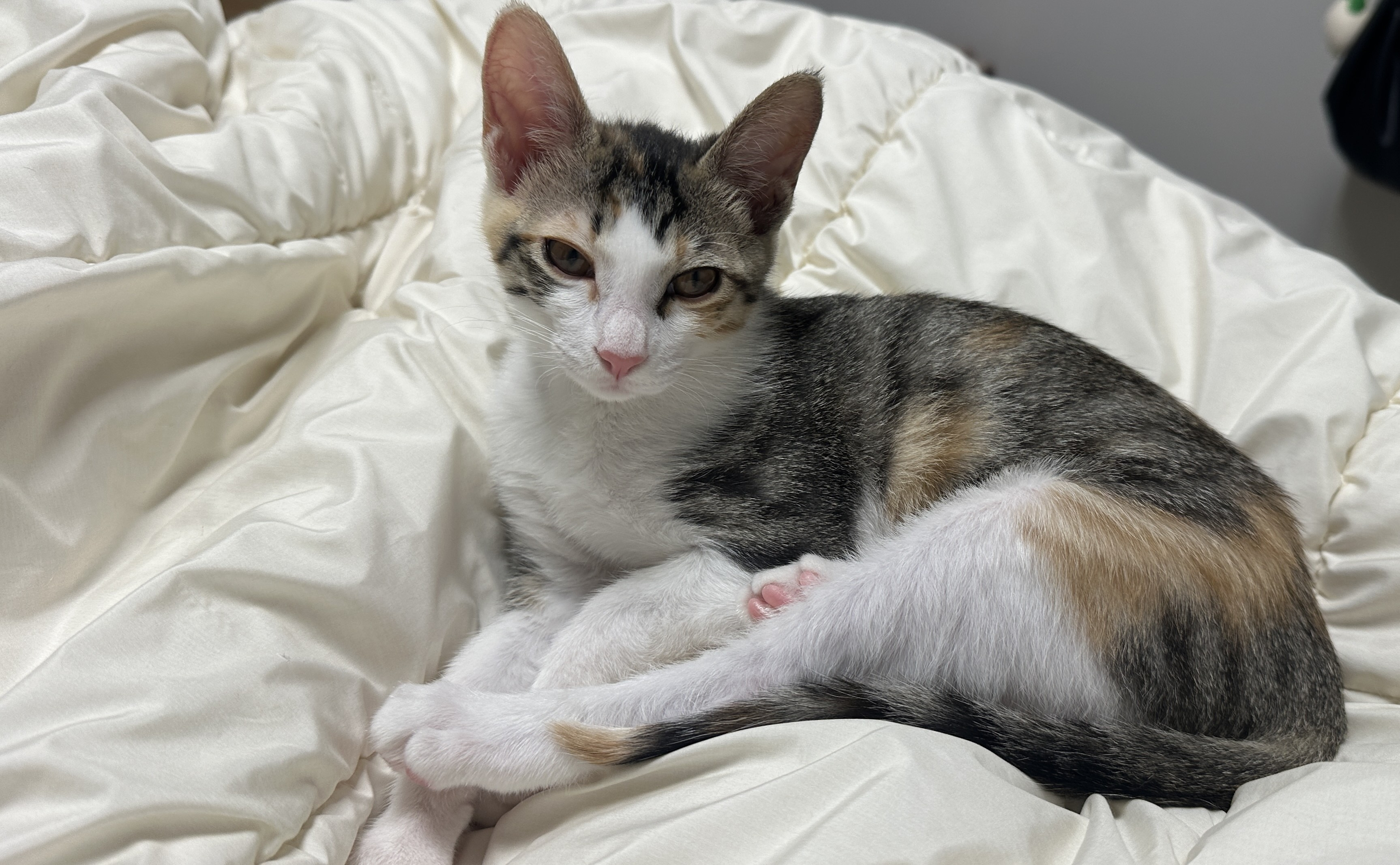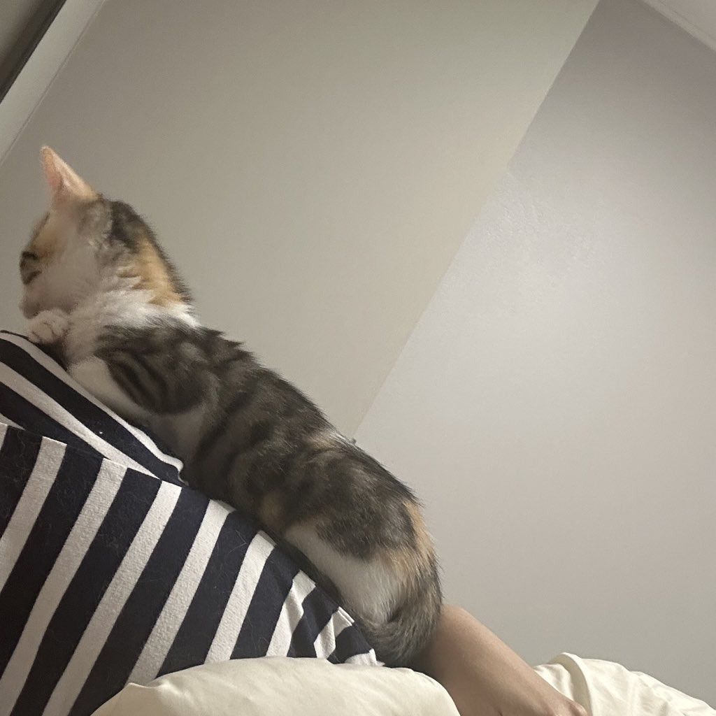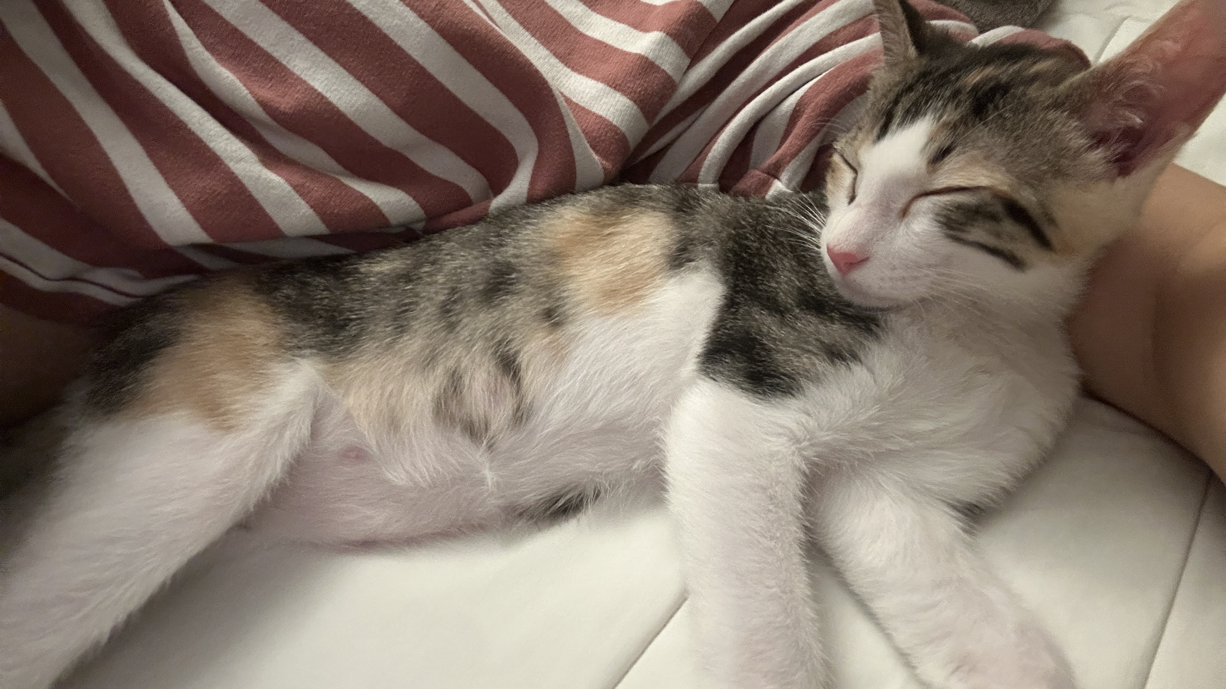구조 이야기 : 생후 2주차에 중학교 화단 구석에 형제냥이 1마리랑 같이 있었음. 학생들이 만져대고, 돌을 던지기도 해서 어미냥이가 올 때까지 기다렸다가 안와서 구조. (물론 곁에서 다치지 않도록 지켜준 학생들도 있음!)