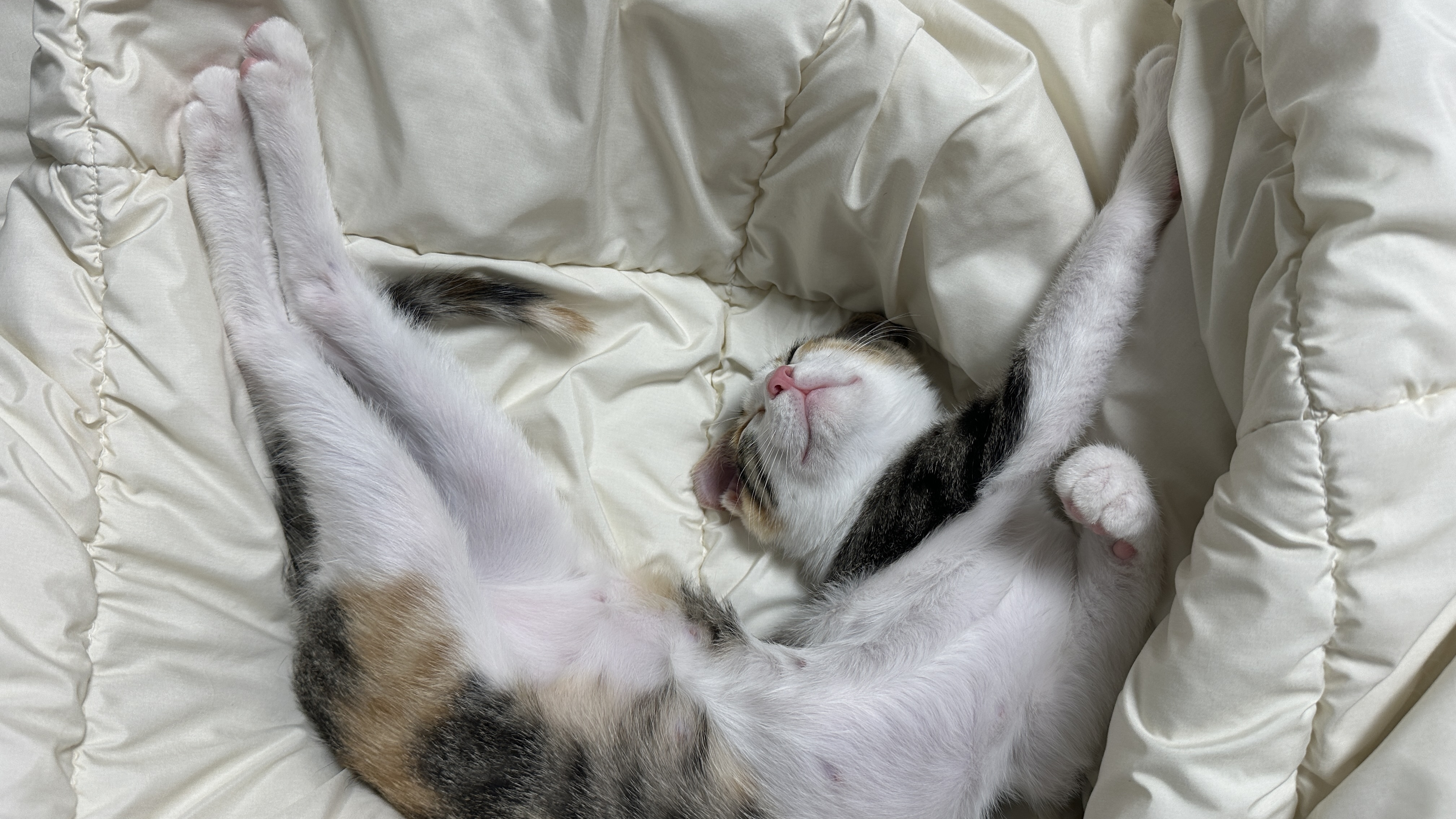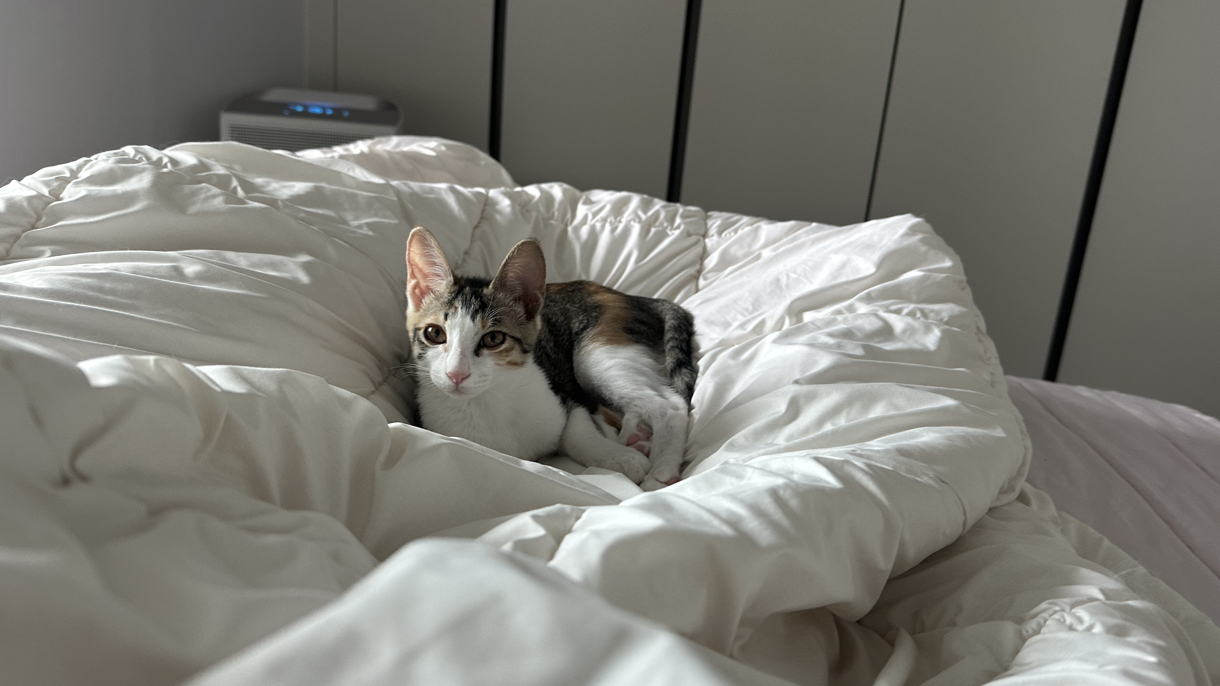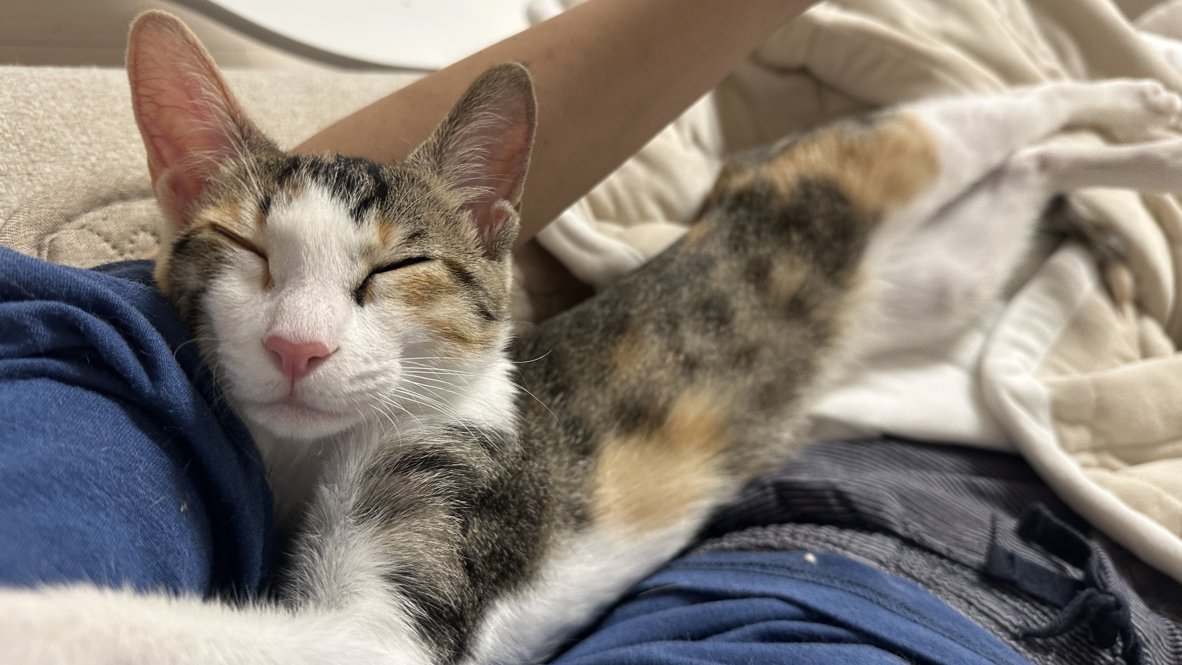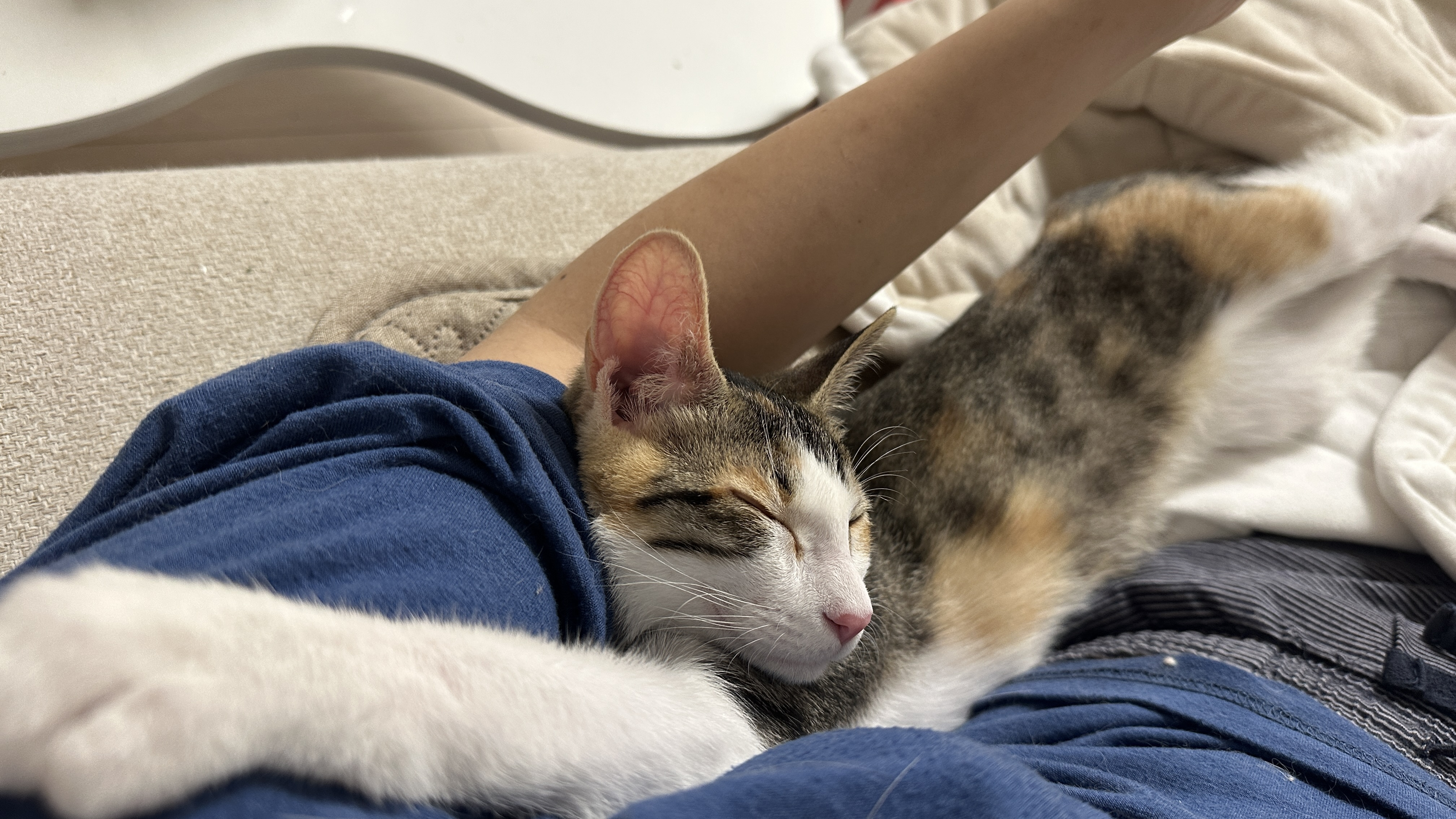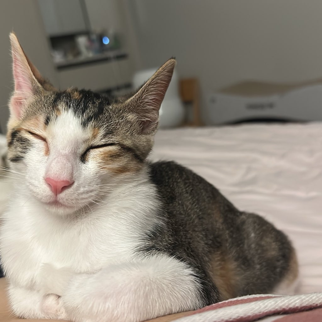 구조 이야기 : 생후 2주차에 중학교 화단 구석에 형제냥이 1마리랑 같이 있었음. 학생들이 만져대고, 돌을 던지기도 해서 어미냥이가 올 때까지 기다렸다가 안와서 구조. (물론 곁에서 다치지 않도록 지켜준 학생들도 있음!)
