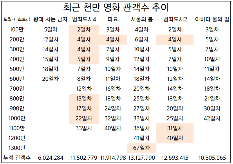 작성자도라큘라 작성시간 26.02.24 파묘 2주만에 600만 넘었었는데 그 이후 천만까진 시간이 좀 걸렸었네...? 왕사남도 천만 갈거 같음ㅋㅋ난 연휴 전엔 700만 예상했는데