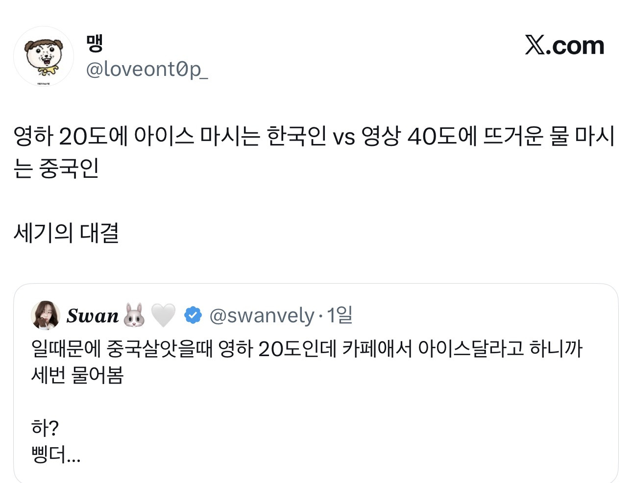 [흥미돋]영하 20도에 아이스 마시는 한국인 vs 영상 40도에 뜨거운 물 마시는 중국인 작성자바나나스플릿구슬|작성시간26.02.24|조회수13,792 목록 댓글 16 글자크기 작게가 글자크기 크게가 출처: https://x.com/loveont0p_/status/2025837322789601478?s=46&t=v7QMmEln8v7WsADFKYn65gX의 맹님(@loveont0p_)영하 20도에 아이스 마시는 한국인 vs 영상 40도에 뜨거운 물 마시는 중국인 세기의 대결x.com 다음검색 현재 게시글 추가 기능 열기 북마크 공유하기 신고 센터로 신고 댓글 댓글 16 댓글쓰기 답글쓰기 댓글 리스트 답댓글 작성자체리펀치 | 작성시간 26.02.24 ㅋㅋㅋㅋㅋㅋㅋㅋㅋㅋㅋㅋㅋㅋ 작성자부메리카노 | 작성시간 26.02.24 후자가 진짜 광인이지 작성자야르아자리 | 작성시간 26.02.24 나는 추운거 진짜싫어아는데도 후자가 더 광인같아... 작성자Moleskine | 작성시간 26.02.24 후자는 진짜 광기같애.. 작성자나무위소총든고양이 | 작성시간 26.02.24 후자가 광인 댓글 전체보기