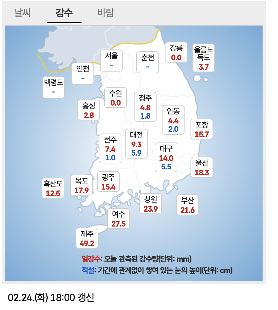 [흥미돋]현재 전국 일강수량(18시 기준) 작성자REVERXE|작성시간26.02.24|조회수21,395 목록 댓글 6 글자크기 작게가 글자크기 크게가 출처:https://theqoo.net/square/4105454807 다음검색 현재 게시글 추가 기능 열기 북마크 공유하기 신고 센터로 신고 댓글 댓글 6 댓글쓰기 답글쓰기 댓글 리스트 작성자부찌대개 | 작성시간 26.02.24 와 대구 눈 많이오네 작성자포항스틸러스 | 작성시간 26.02.24 대구 미쳤어…. 작성자명란대파소금빵 | 작성시간 26.02.24 강원도 건조할텐데 안오네 ㅜ 작성자장센치 | 작성시간 26.02.24 제주도 비 하루종이 엄청 많이옴 ㅠㅠ 작성자파이어좃 | 작성시간 26.02.24 제주도왜저래ㅜㅜ나가야되는데 댓글 전체보기