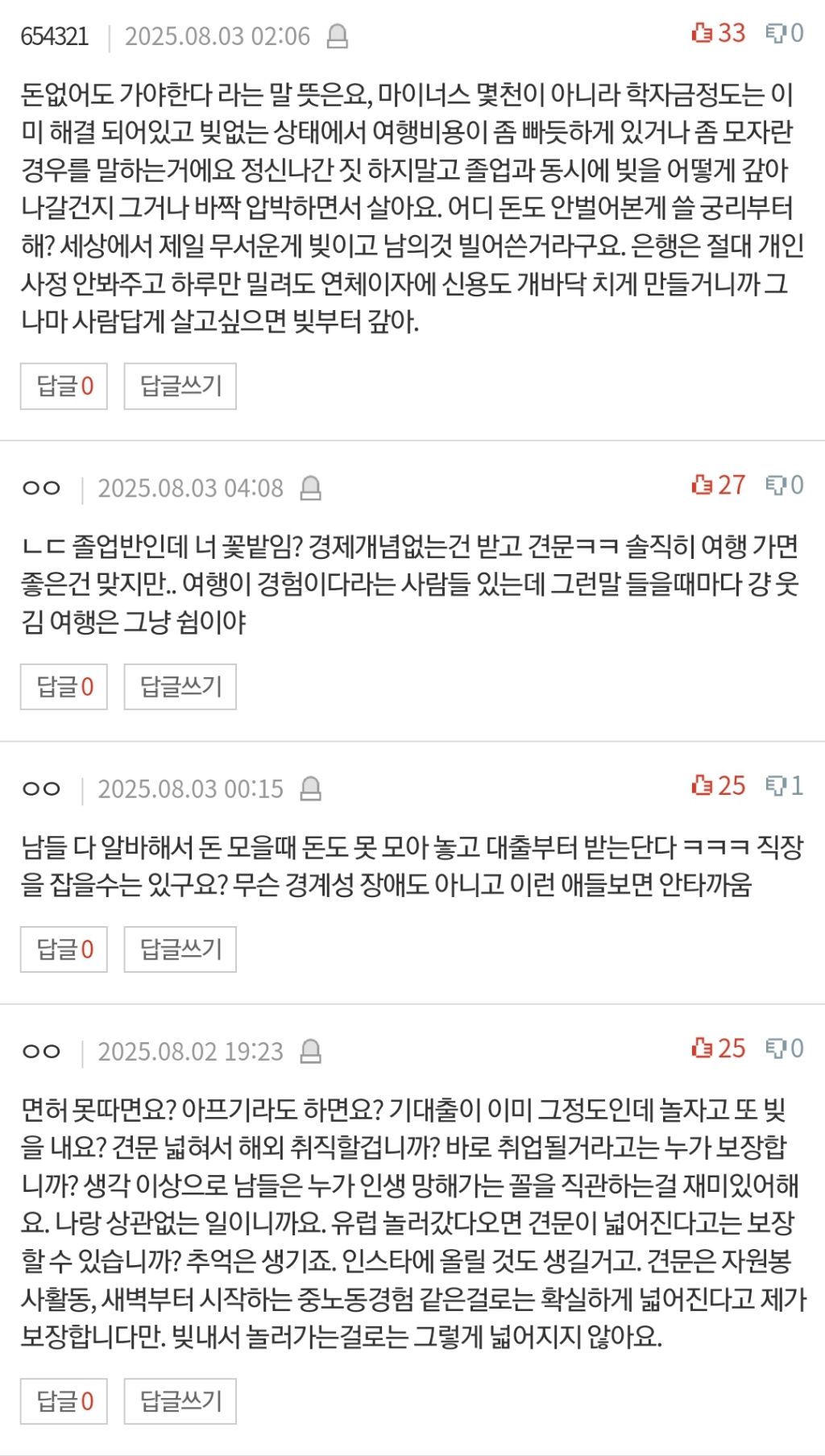 작성자air. 작성시간 26.02.25 저렇게까지 저나이에 꼭해야하는지는 모르겠다만.. 밖에서당당하게말하지못할일은 안하는게맞다.. 오히려 경제력갖춰놓고 여행가는게 훨씬 즐거움