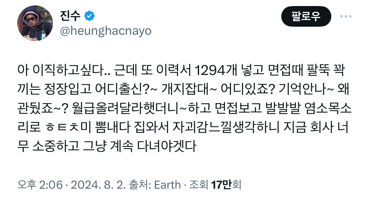 [스크랩] [흥미돋]아 이직하고싶다.. 작성자solulu|작성시간26.02.24|조회수10,915 목록 댓글 10 글자크기 작게가 글자크기 크게가 출처: https://x.com/heunghacnayo/status/1819238436081225770?s=46&t=v7QMmEln8v7WsADFKYn65gX의 진수님(@heunghacnayo)아 이직하고싶다.. 근데 또 이력서 1294개 넣고 면접때 팔뚝 꽉끼는 정장입고 어디출신?~ 개지잡대~ 어디있죠? 기억안나~ 왜관뒀죠~? 월급올려달라햇더니~하고 면접보고 발발발 염소목소리로 ㅎㅌx.comhttps://youtu.be/D5F9xds-yGI?si=bTcxgXgdJTTQm5N_ 다음검색 스크랩 원문 : *여성시대* 차분한 20대들의 알흠다운 공간 현재 게시글 추가 기능 열기 북마크 공유하기 신고 센터로 신고 댓글 댓글 10 댓글쓰기 답글쓰기 댓글 리스트 작성자주식부자원츄 | 작성시간 26.02.24 아시발 내가 이직못히는이유 ㅋㅋㅋㅋ 작성자잘빠진햄스터 | 작성시간 26.02.24 하... 작성자치즈파레 | 작성시간 26.02.24 요즘 거의 매일 생각하는 흐름ㅎ 작성자kiiikiii키야 | 작성시간 26.02.24 진짜 면접보는게 세상에서 제일 싫어서 버틴다 작성자인생뭐있어1 | 작성시간 26.02.25 아 진짜..ㅜ 끔찍 댓글 전체보기