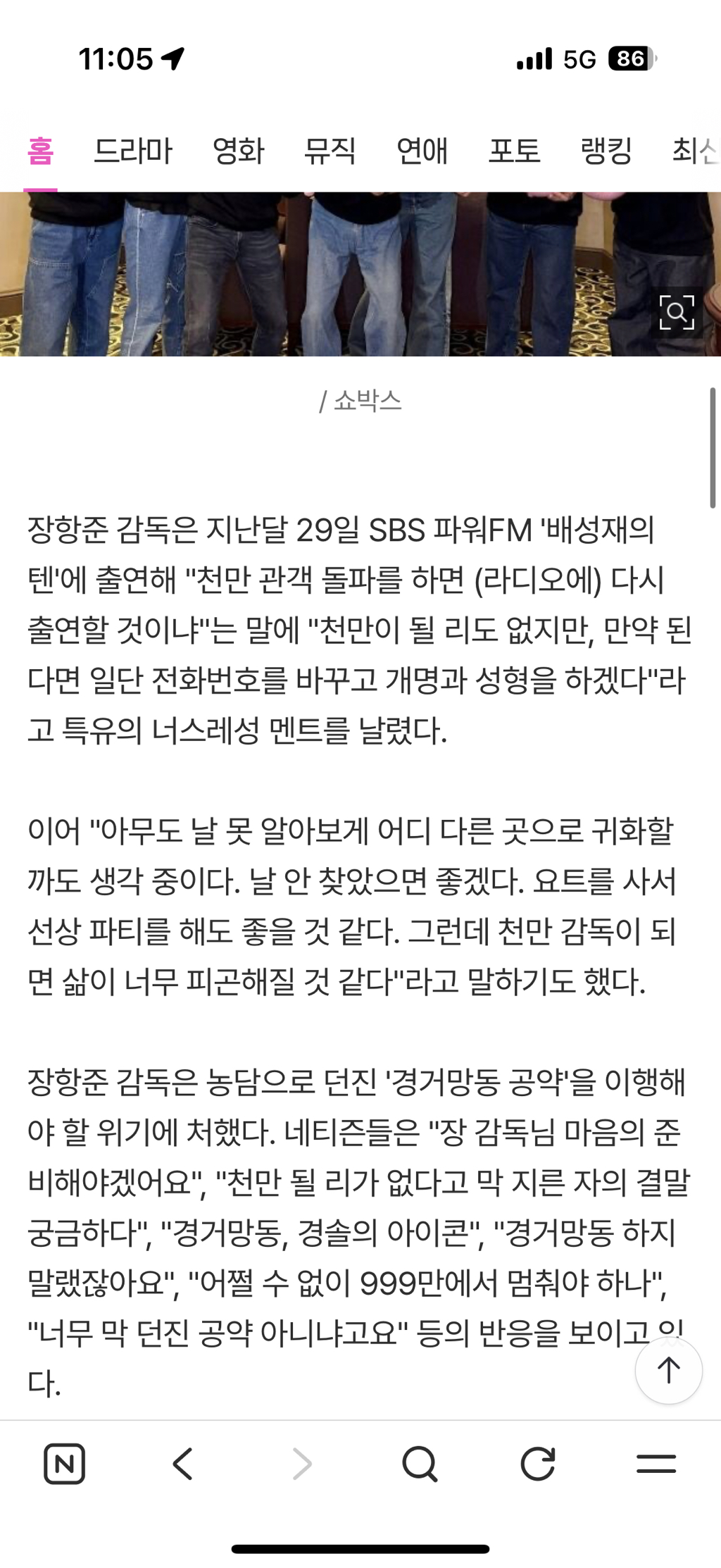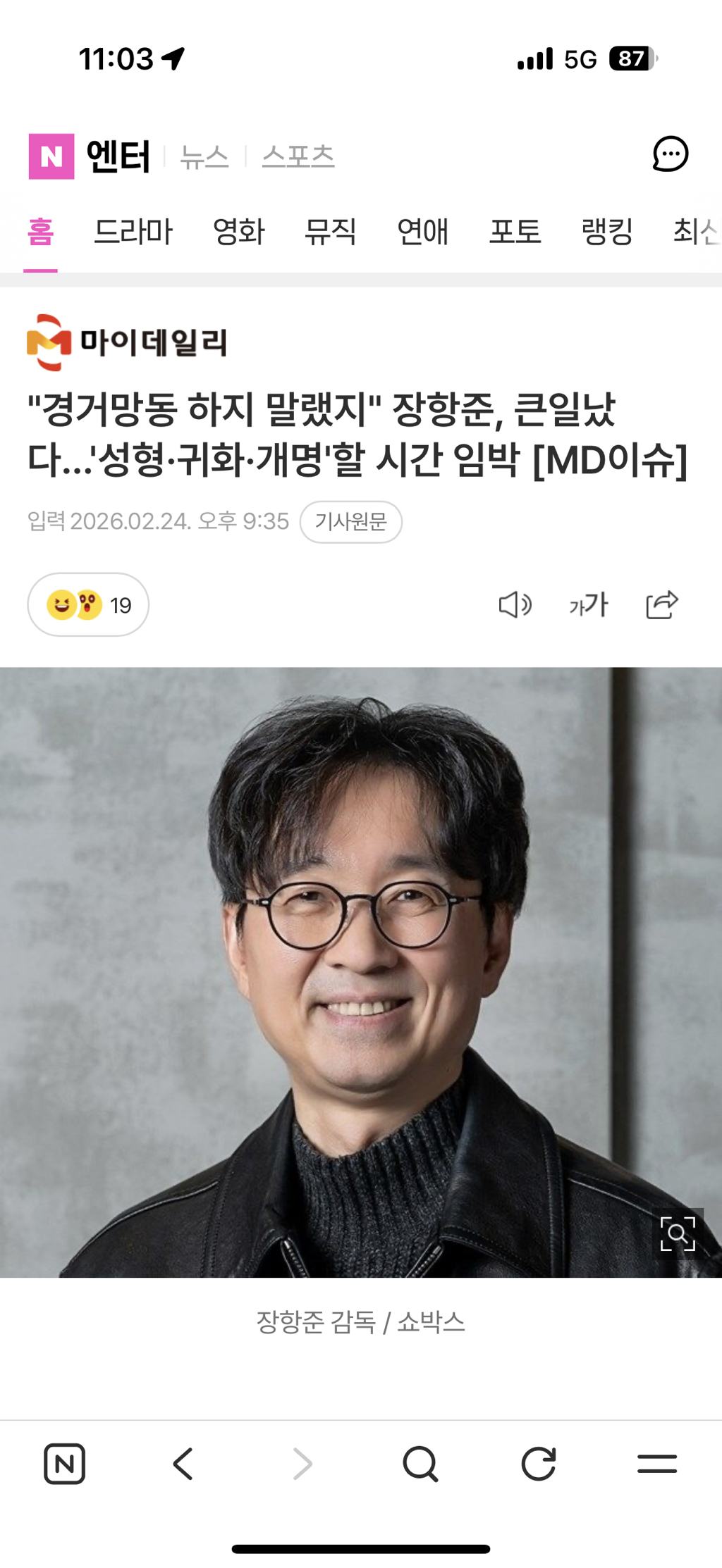 [여시뉴스데스크]"경거망동 하지 말랬지" 장항준, 큰일났다…'성형·귀화·개명'할 시간 임박 [MD이슈] 작성자Okaiieee|작성시간26.02.24|조회수46,912 목록 댓글 36 글자크기 작게가 글자크기 크게가 출처: https://m.entertain.naver.com/home/article/117/0004038300"경거망동 하지 말랬지" 장항준, 큰일났다…'성형·귀화·개명'할 시간 임박 [MD이슈]여기를 눌러 링크를 확인하세요m.entertain.naver.com 다음검색 현재 게시글 추가 기능 열기 북마크 공유하기 신고 센터로 신고 댓글 댓글 36 댓글쓰기 답글쓰기 댓글 리스트 작성자나의 라임 오지는 나무 | 작성시간 26.02.25 아진짜 개웃곀ㅋㅋㅋㅋㅋ 작성자국장미장레츠꼬 | 작성시간 26.02.25 ㅌㅌㅋㅋㅋㅋㅋㅋㅋ 작성자왓츠유어네임? 싸브레? | 작성시간 26.02.25 아 개쳐웃기다 ㅋㅋㅋㅋㅋ어떡해 작성자아흐레 | 작성시간 26.02.25 다른건 그런다 쳐도 귀화 어쩔거냐곸ㅋㅋㅋㅋㅋㅋㅋ아니 왜 or이 아니라 and로 해가지곸ㅋㅋㅋㅋㅋㅋㅋㅋㅋㅋㅋㅋㅋㅋㅋ 작성자고객님의용기를지지합니다 | 작성시간 26.02.25 참낰ㅋㄱㅋㄱㅋㄱㅋㄱㄱㄱ개웃깅ㄲㄱㅋㅋ 댓글 전체보기