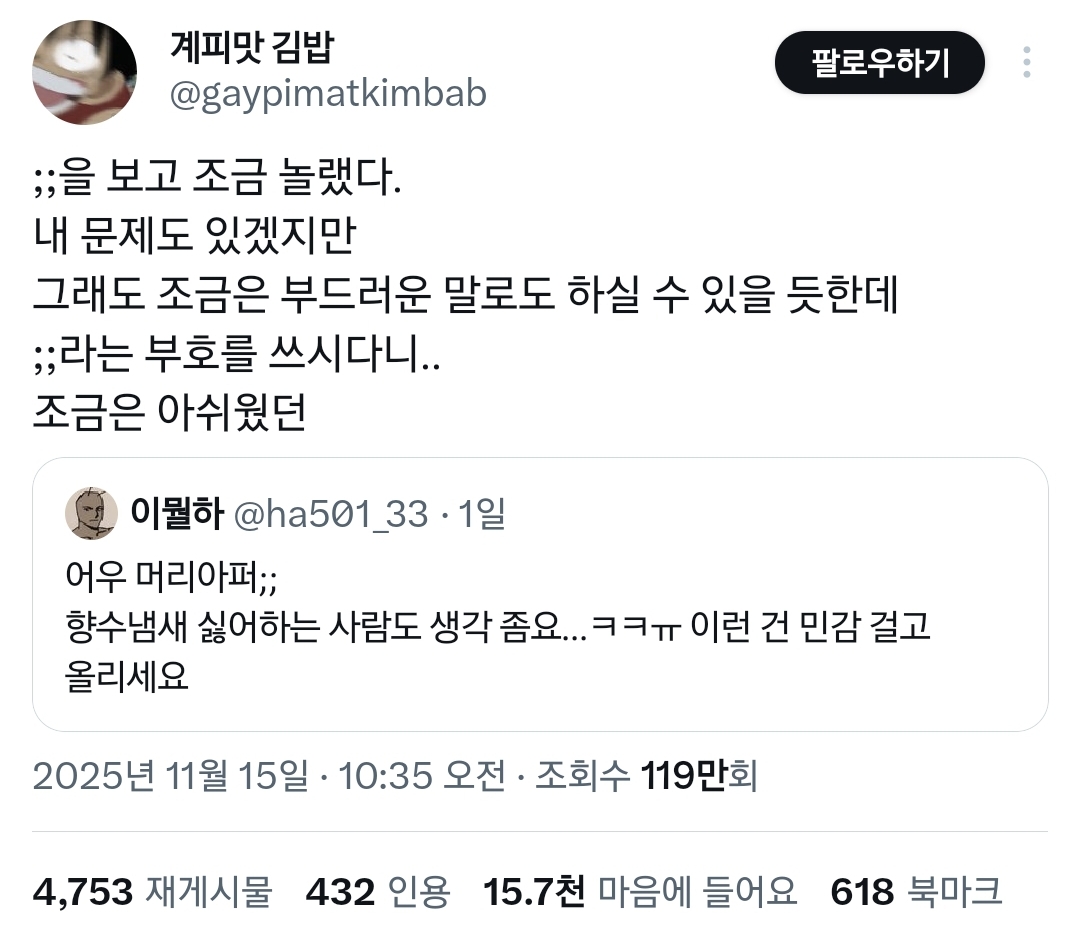 작성자shinyu 작성시간 26.02.25 안녕하세요! 향이 너무 좋아서 그런데 향수 몬지 알려주실 수 있으실까요…🥺