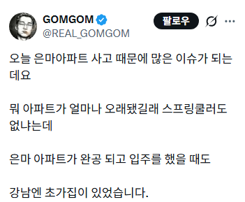 [흥미돋]은마아파트에 스프링클러 없는 이유 작성자(본인 닉네임),|작성시간26.02.25|조회수70,190 목록 댓글 73 글자크기 작게가 글자크기 크게가 출처: https://x.com/REAL_GOMGOM/status/2026294116926296542?s=20 강남에 초가집 있을 때 지어져서 은마아파트는 1979년 8월에 준공 및 입주를 시작 다음검색 현재 게시글 추가 기능 열기 북마크 공유하기 신고 센터로 신고 댓글 댓글 73 댓글쓰기 답글쓰기 댓글 리스트 작성자최강 강아지 마루 | 작성시간 26.02.25 79년????? 와 얼마를 존버중인거야 작성자짱쨩한쿵잔치 | 작성시간 26.02.25 생각보다 얼마 안됐는데 ...??? 작성자나 6천원 있어요... | 작성시간 26.02.25 어? 작성자망고바나나aaa | 작성시간 26.02.25 헐... 작성자염두리와는 인연이 깊어요 | 작성시간 26.03.02 ..!? 댓글 전체보기