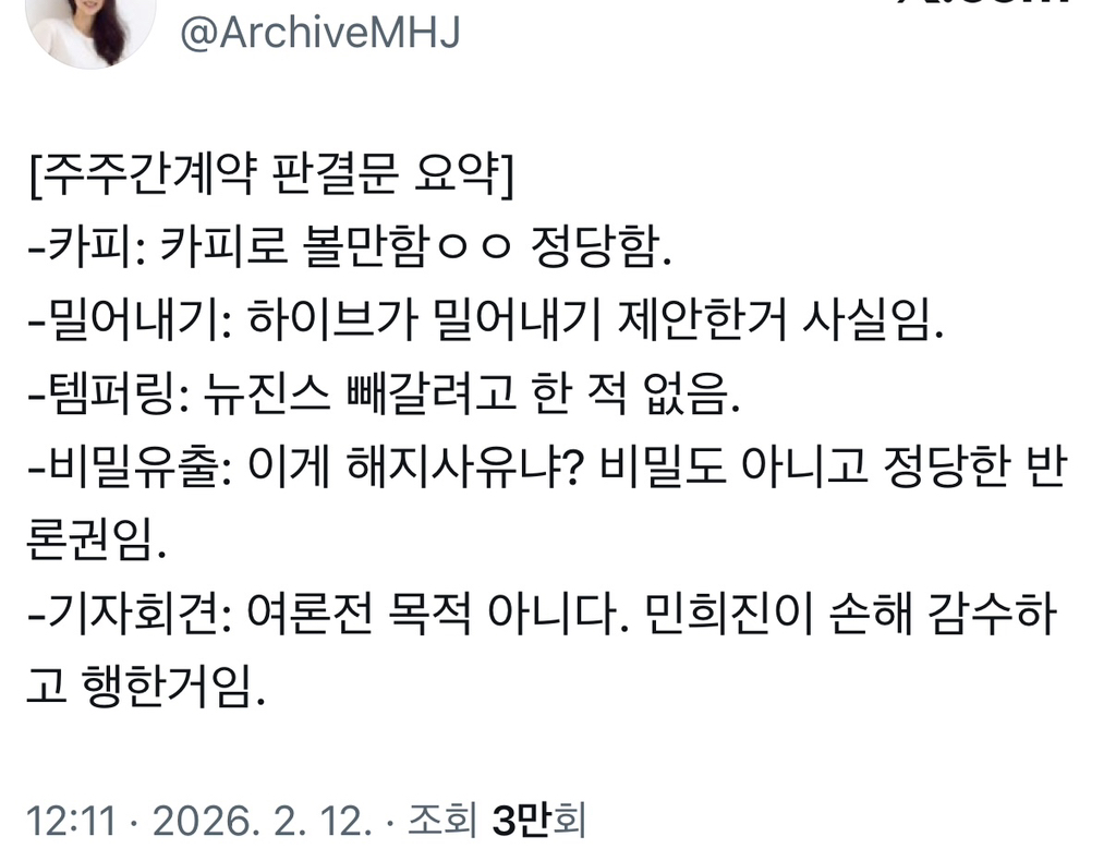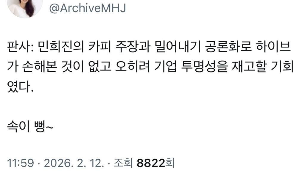 [스크랩] [흥미돋]민희진과 5가지 법적싸움에서 모두 완패한 하이브 작성자서울엘지꿈을향해달려가자|작성시간26.02.25|조회수20,781 목록 댓글 28 글자크기 작게가 글자크기 크게가 출처: https://x.com/ArchiveMHJ/status/2021784139754848382?s=20 다음검색 스크랩 원문 : *여성시대* 차분한 20대들의 알흠다운 공간 현재 게시글 추가 기능 열기 북마크 공유하기 신고 센터로 신고 댓글 댓글 28 댓글쓰기 답글쓰기 댓글 리스트 작성자잔바걸 | 작성시간 26.02.25 에혀 ㅠㅠ 뉴진스는 가장이쁠때 이년을 날렸는데 너무아쉬움 작성자qkejdbcwjwjf | 작성시간 26.02.25 아직도 할 말이 있으면 해봐라 작성자when i move | 작성시간 26.02.25 하이브 ㅈㄴ 짜쳐 작성자버터계란빵 | 작성시간 26.02.25 법 전문가들 나타나서 또 붕ㅇ얼붕얼 해줘야지ㅜ 다 어디로 사라진거지? 작성자램프의제자 | 작성시간 26.02.26 미국 태그피알도 ㅋㅋ 남아있음 댓글 전체보기