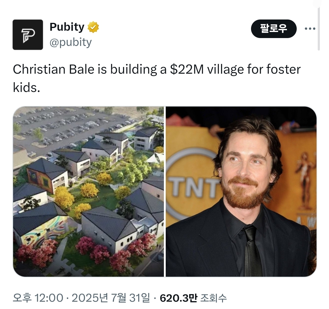 [스크랩] [흥미돋]크리스찬 베일이 300억으로 하는 일 작성자Tory-|작성시간26.02.25|조회수16,573 목록 댓글 31 글자크기 작게가 글자크기 크게가 출처: https://x.com/pubity/status/1950753293119959389위탁 아동들이 형제 자매와 헤어지지 않고 살 수 있게 빌리지 건설중오래전부터 준비했는데 허가 받을게 많아서 몇년 걸림자기도 이렇게 빡셀지 몰랐다고 함 ㅋㅋㅋ옆엔 아내!자기도 자식있는 아버지라 한 일이라고 함이스라엘에 호텔 짓는 레오랑 비교돼서 더 찬양받는중 다음검색 스크랩 원문 : *여성시대* 차분한 20대들의 알흠다운 공간 현재 게시글 추가 기능 열기 북마크 공유하기 신고 센터로 신고 댓글 댓글 31 댓글쓰기 답글쓰기 댓글 리스트 작성자Under the Moonlight | 작성시간 26.02.25 멋져 ㅠ 작성자앙버터소금빵 | 작성시간 26.02.25 웨인햄.. 작성자하와이이 | 작성시간 26.02.25 진짜 다크나이트다... 작성자치폴레마요냠냠 | 작성시간 26.02.26 브루스웨인 ㅠㅠ 작성자청송사과 | 작성시간 26.02.26 오래 사시요 빛의 브루스 웨인..ㅠㅠ 댓글 전체보기
