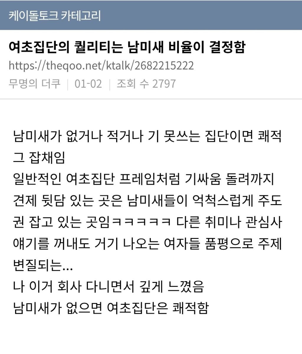 작성자반숙간계밥 작성시간 26.02.26 하 ㅜ 남미새 적은 여초팀 진짜 좋았는데.. 우린 연애하는 사람들도 남미새발언 안해서 진~짜 쾌적하고 좋았다가 상사가 기혼남미새로 오면서 여자애들은 예민하고 이지랄하면서 견제하고 괴롭혀서 탈출함
