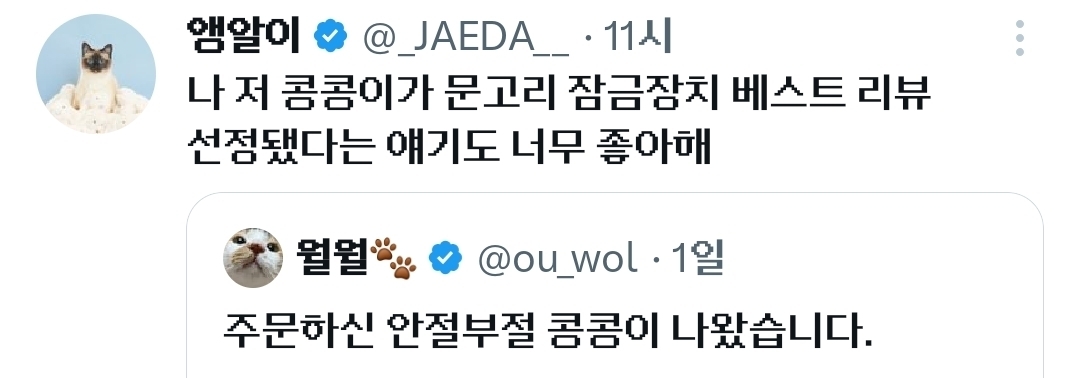 [흥미돋]문고리 잠금장치 베스트 리뷰.x 작성자누룩곰팡이|작성시간26.02.25|조회수40,652 목록 댓글 17 글자크기 작게가 글자크기 크게가 출처: https://x.com/i/status/2026130177168994793동영상 클릭기를 쓰고 열려는중.. 다음검색 현재 게시글 추가 기능 열기 북마크 공유하기 신고 센터로 신고 댓글 댓글 17 댓글쓰기 답글쓰기 댓글 리스트 작성자Moleskine | 작성시간 26.02.25 대박 귀요미 ㅠㅜ 작성자닥터후 | 작성시간 26.02.25 아 저게 짱임 성인도 모르면못열어ㅋㅋㅋㅋ 작성자ktx청룡 | 작성시간 26.02.26 그냥 냥이가 문 열게 해주시면 안될까여ㅠㅠ 저렇게 간절한데 흑흑 답댓글 작성자쭈꾸미게임 | 작성시간 26.02.26 왜냐면… 절케 간절하게 열어놓고… 1초만 보고 가기 때문. 잠에 드는데 추워서 일어나보면 덩그러니 열려진 문과 쎄한 공기뿐 작성자땅뚱뚱이 | 작성시간 26.02.26 진짜 귀엽다 댓글 전체보기