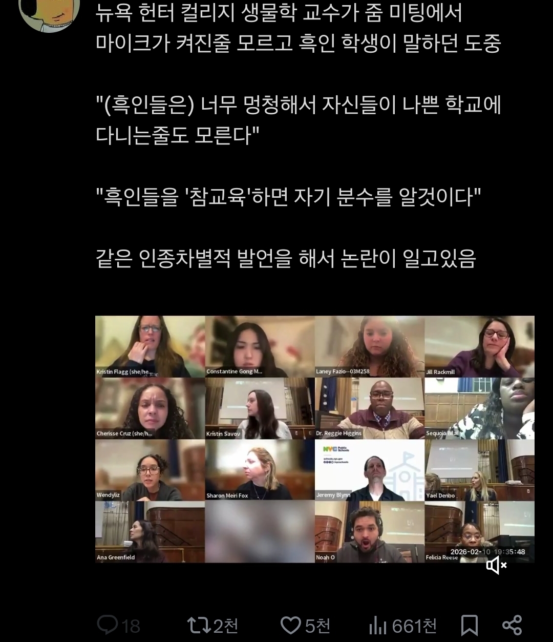 [기타]최근 미국에서 일어난 '흑인은 xx 멍청해' 사건 작성자반 띵 톡|작성시간26.02.25|조회수27,943 목록 댓글 8 글자크기 작게가 글자크기 크게가 출처: https://x.com/Muy_bien_Y_tu/status/2026400536916836485?s=20 다음검색 현재 게시글 추가 기능 열기 북마크 공유하기 신고 센터로 신고 댓글 댓글 8 댓글쓰기 답글쓰기 댓글 리스트 작성자동동취 | 작성시간 26.02.25 ㅁㅊ.... 작성자이겨버렸다노 | 작성시간 26.02.26 미쳣다 작성자암국 | 작성시간 26.02.26 ㅁㅊ 작성자문오언. | 작성시간 26.02.26 헐....... 작성자Overthinking | 작성시간 26.02.26 와우 댓글 전체보기