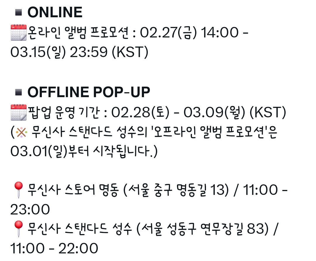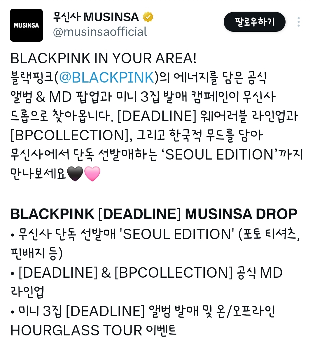 [흥미돋]블랙핑크 앨범 발매 기념으로 나오는 ‘SEOUL EDITION’ 엠디 작성자김 재영|작성시간26.02.26|조회수10,978 목록 댓글 31 글자크기 작게가 글자크기 크게가 출처: https://x.com/musinsaofficial/status/2026854746779431155?s=20X의 무신사 MUSINSA님(@musinsaofficial)BLACKPINK IN YOUR AREA! 블랙핑크(@BLACKPINK)의 에너지를 담은 공식 앨범 & MD 팝업과 미니 3집 발매 캠페인이 무신사 드롭으로 찾아옵니다. [DEADLINE] 웨어러블 라인업과 [BPCOLLECTION], 그리고 한국적 무드를 x.com 다음검색 현재 게시글 추가 기능 열기 북마크 공유하기 신고 센터로 신고 댓글 댓글 31 댓글쓰기 답글쓰기 댓글 리스트 작성자K민희im | 작성시간 26.02.26 온라인은 품절각인데 팝업을 가야하나... 작성자녹차라떼에샷추가요 | 작성시간 26.02.26 서울티셔츠이쁘다 작성자ㅉㅉ왜사냐?? | 작성시간 26.02.26 헐 아니 예쁜데? 작성자내뜻대로됐다 | 작성시간 26.02.27 국뽕 차오른다 작성자미래엔미국으로ORN | 작성시간 26.02.28 명동은 안판다는거겟지...??? 댓글 전체보기