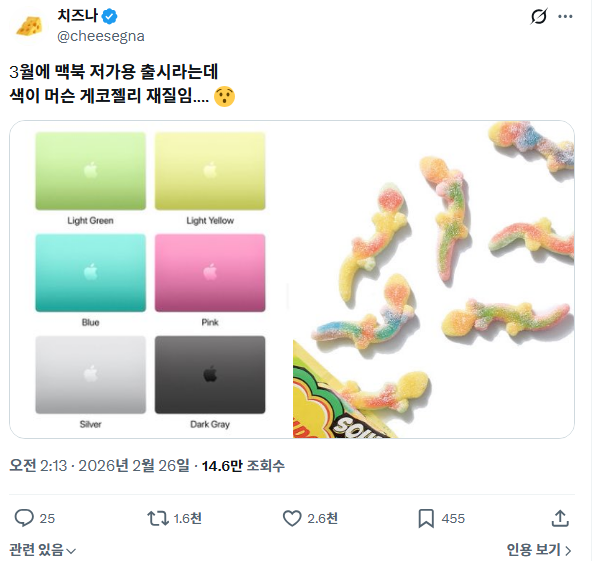 [흥미돋]26년 3월 맥북 저가형 출시 색상 작성자SONGGEONHEE|작성시간26.02.26|조회수35,146 목록 댓글 86 글자크기 작게가 글자크기 크게가 출처: 여성시대 SONGGEONHEEhttps://x.com/cheesegna/status/2026707143811125594?s=20X의 치즈나님(@cheesegna)3월에 맥북 저가용 출시라는데 색이 머슨 게코젤리 재질임.... 😯x.com 다음검색 현재 게시글 추가 기능 열기 북마크 공유하기 신고 센터로 신고 댓글 댓글 86 댓글쓰기 답글쓰기 댓글 리스트 작성자쪼오림 | 작성시간 26.02.26 핑크색 줄라예쁘다 .... 다예쁜데....? 작성자곰브리치야 내 이름 적어둬라 | 작성시간 26.02.27 라이트그린 사고싶다 작성자창문열고들숨날숨 | 작성시간 26.02.27 이렇게 보면 색은 좀 촌스러운디 작성자냥냐라옹 | 작성시간 26.02.27 핑크 ㅈㄴ사고십네 작성자pbieto | 작성시간 26.03.03 환율....ㅎㄷㄷ..환율생각 플리즈 댓글 전체보기