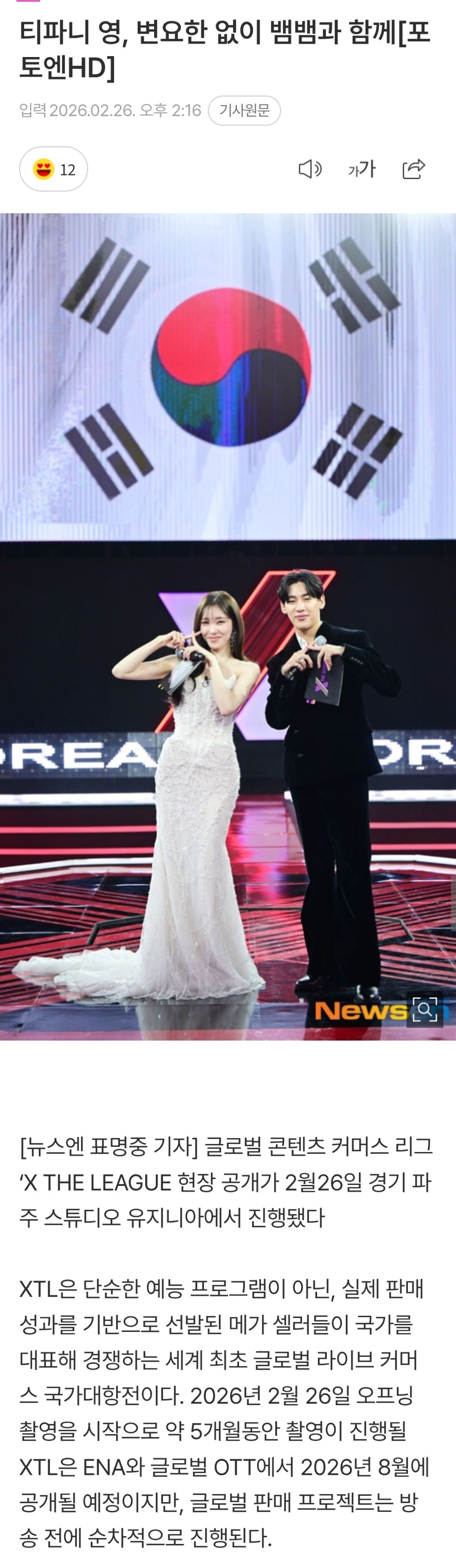 [여시뉴스데스크]티파니 영, 변요한 없이 뱀뱀과 함께 작성자베리밤훼이크|작성시간26.02.26|조회수25,714 목록 댓글 15 글자크기 작게가 글자크기 크게가 출처: https://naver.me/F8lxQlPA티파니 영, 변요한 없이 뱀뱀과 함께[포토엔HD]여기를 눌러 링크를 확인하세요m.entertain.naver.com본문 출처로 XTL은 ENA와 글로벌 OTT에서 2026년 8월에 공개될 예정 다음검색 현재 게시글 추가 기능 열기 북마크 공유하기 신고 센터로 신고 댓글 댓글 15 댓글쓰기 답글쓰기 댓글 리스트 작성자고내기 | 작성시간 26.02.26 제목 으휴 진짜 작성자지만편한세상 | 작성시간 26.02.26 티파니가 변씨보다 훨씬 유명하지않음? 커리어도 그렇고 제목 그지같이 뽑네 작성자이재명이 대통령이 됐으면 좋겠어 | 작성시간 26.02.26 변요한이뭐.. 티파니영인데...... 작성자나나나난나나 | 작성시간 26.02.27 시펄 ㅁ ㅓ 변요한 없음 생활 못하냐 여자를 등신으로 보네 진짜 작성자잔잔하게 잘살자 | 작성시간 26.02.27 일하는곳에 먼일인데 제목 댓글 전체보기