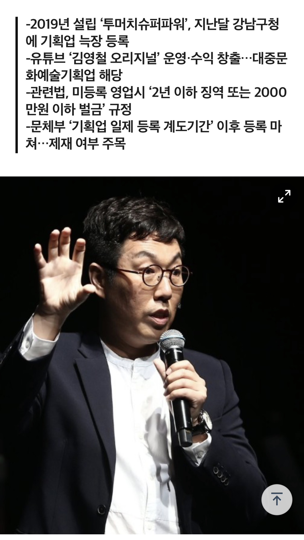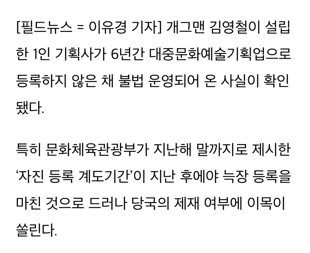 [여시뉴스데스크][단독] 개그맨 김영철, 1인 기획사 6년간 미등록 운영…계도기간 후 늑장 등록 작성자십육초|작성시간26.02.26|조회수69,393 목록 댓글 14 글자크기 작게가 글자크기 크게가 출처: http://www.fieldnews.kr/news/articleView.html?idxno=26541[단독] 개그맨 김영철, 1인 기획사 6년간 미등록 운영…계도기간 후 늑장 등록[필드뉴스 = 이유경 기자] 개그맨 김영철이 설립한 1인 기획사가 6년간 대중문화예술기획업으로 등록하지 않은 채 불법 운영되어 온 사실이 확인됐다. 특히 문화체육관광부가 지난해 말까지로 www.fieldnews.kr 다음검색 현재 게시글 추가 기능 열기 북마크 공유하기 신고 센터로 신고 댓글 댓글 14 댓글쓰기 답글쓰기 댓글 리스트 작성자미묘라지요 | 작성시간 26.02.26 와우ㅋ 작성자mancity | 작성시간 26.02.27 으잉 작성자체리우정 | 작성시간 26.02.27 미스틱 아니였어..? 차은우 루트로 1인법인 따로 있는건가 작성자불로케리 | 작성시간 26.02.27 드디어 작성자움파룸파파아 | 작성시간 26.02.27 존나꼴보기싫네 댓글 전체보기