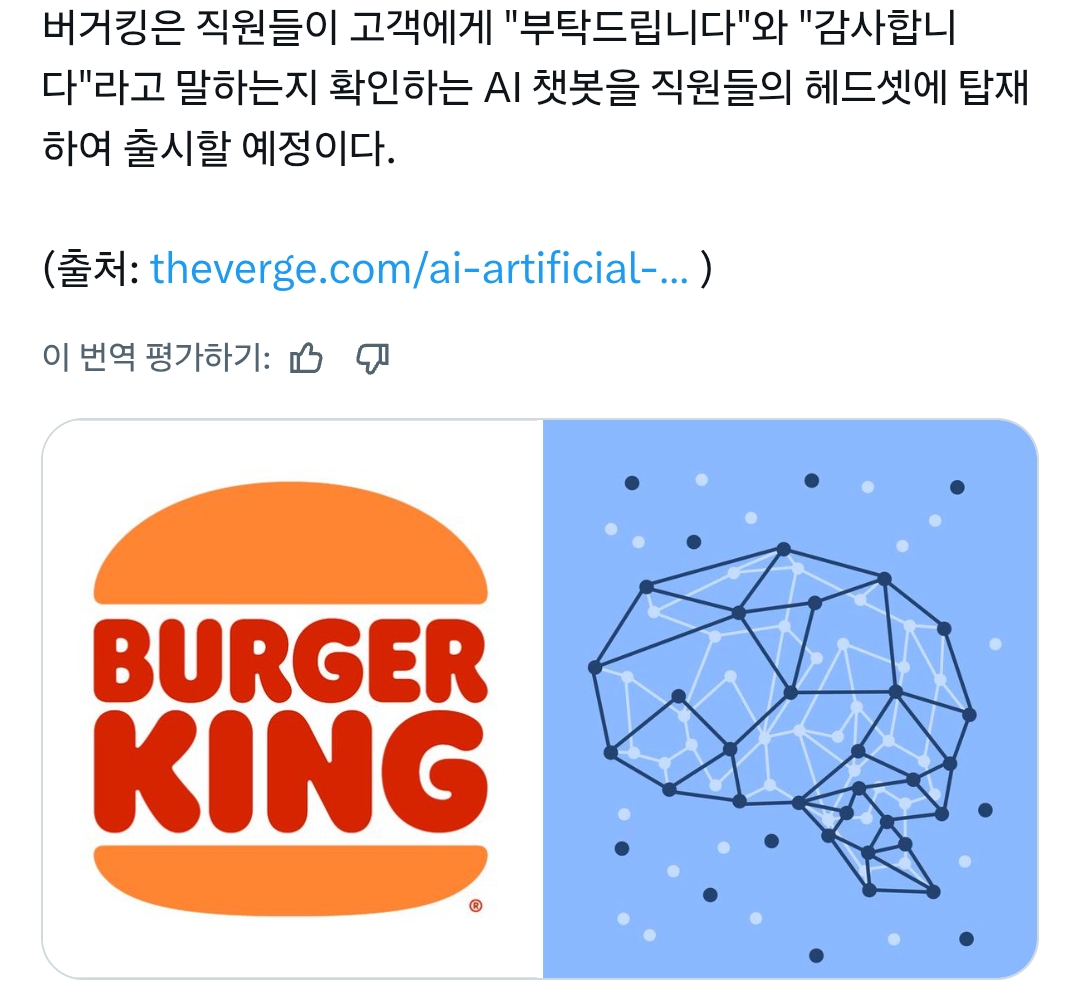 [흥미돋]곧 버거킹 직원들에게 적용될 ai 기술 작성자fjskal|작성시간26.02.26|조회수43,564 목록 댓글 41 글자크기 작게가 글자크기 크게가 출처: https://x.com/DiscussingFilm/status/2027018716366483961?s=20 다음검색 현재 게시글 추가 기능 열기 북마크 공유하기 신고 센터로 신고 댓글 댓글 41 댓글쓰기 답글쓰기 댓글 리스트 작성자실용적인 대머리 | 작성시간 26.02.27 뭔 부탁드립니다야 작성자힐러 | 작성시간 26.02.27 지랄 진짜 트러플이나 상시메뉴해 작성자가다실 여성시대 | 작성시간 26.02.27 ㅈㄹ 햄버거나 제대로 개발해라.. 작성자사랑방캔디 | 작성시간 26.02.27 치즈프라이나 내놔 작성자고종 | 작성시간 26.02.27 햄버거 만들어주는 기계나 개발하셈 댓글 전체보기