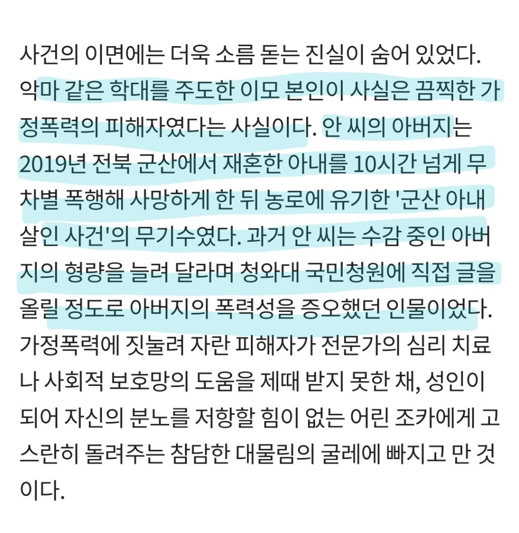 답댓글 작성자나프록센 작성시간 26.02.27 그리고 가해자도 아동학대피해자라고 감싸는 말도 나오는디 이 사건 첨부터 쭉 보면 그냥 지아빠 유전자 타고났다는말 나올수밖에없음 진심 지아빠랑 똑같아 ㅠ 부검하신 분도 맡은 아동학대사건중에 제일 질나쁘다함