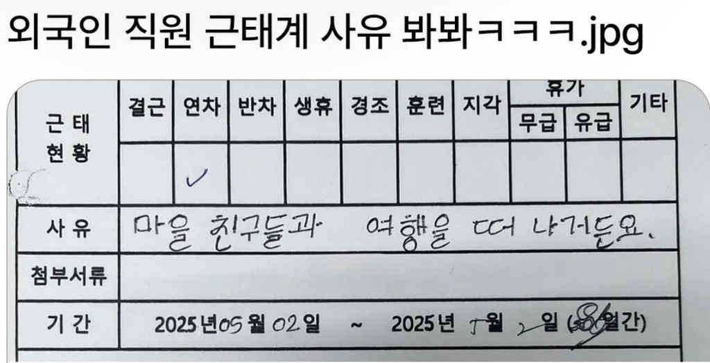 [스크랩] [흥미돋]외쿡인 근로자의 흔한 연차 사유.jpg 작성자오더|작성시간26.02.27|조회수43,241 목록 댓글 21 글자크기 작게가 글자크기 크게가 그래서 기분이가 조커든요 다음검색 스크랩 원문 : 이종격투기 현재 게시글 추가 기능 열기 북마크 공유하기 신고 센터로 신고 댓글 댓글 21 댓글쓰기 답글쓰기 댓글 리스트 작성자요즘 난 이래 | 작성시간 26.02.27 귀엽다ㅋㅋㅋㅋㅋㅋㅋㅋㅋㅋㅋㅋ잘다녀와요~ 작성자작은 방 | 작성시간 26.02.27 귀엽 ㅋㅋㅋㅋㅋㅋ 작성자마밀라피나타파이 | 작성시간 26.02.27 ㅋㅋㅋㅋㅋ 즐거운 여행길이 되길 작성자집에가고싶다고요 | 작성시간 26.02.27 이아파 그것도 귀여웠는데 ㅋㅋㅋㅋ 작성자쿄냥이 | 작성시간 26.02.27 ㄱㅇㅇ 댓글 전체보기