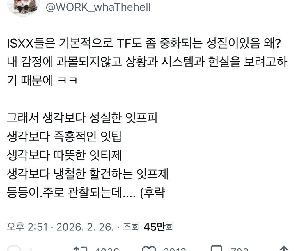 [스크랩] [흥미돋]ISXX들은 기본적으로 TF도 좀 중화되는 성질이있음 왜? 내 감정에 과몰되지않고 상황과 현실을 보려고하기 때문에 ㅋㅋ 그래서 생각보다 작성자초코체리|작성시간26.02.27|조회수17,001 목록 댓글 63 글자크기 작게가 글자크기 크게가 소울드레서는 우리가 만들어가는 소중한 공간입니다.댓글 작성 시 타인에 대한 배려와 책임을 다해주세요.https://x.com/work_whathehell/status/2026897929060135053?s=46저 생각보다 따뜻해여 다음검색 스크랩 원문 : 비공개카페 현재 게시글 추가 기능 열기 북마크 공유하기 신고 센터로 신고 댓글 댓글 63 댓글쓰기 답글쓰기 댓글 리스트 작성자저스트텐분 미만잡 | 작성시간 26.02.27 ㅇㅇ 맞아 눈치 챙기는 중...ㅋㅋㅋㅋ 작성자홈런뽏 | 작성시간 26.02.27 잇팁은 원래 좀 즉흥적이지 않나? 작성자해피강와쥐 | 작성시간 26.02.27 나 t인데 동물한테만f.. 작성자닁기릐마가릔 | 작성시간 26.02.27 맞아 잇프제인데 t냐는 소리 진짜 많이들음할일 없으면 감정에 매몰되서 피폐해지다가도 할일생기면 t로 무장하는 느낌임 작성자lateCheckout | 작성시간 26.02.27 잇프피 지인 진짜 t같음ㅋㅋㅋㅋ 댓글 전체보기