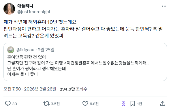 작성자비밀 잠수함 작성시간 26.02.28 누구랑 함께여도 재밌겠지만 힘들 때 숙소 들어와서 쉬고 공원에 앉아서 시간도 보내고 좋았음 다른 사람과 있을 땐 내 마음대로 할 수 없으니까 그리고 1시간 거리여도 뚜벅이로 다니는 거 좋아하는데 그 정도의 뚜벅이로 다니는 걸 좋아하는 사람이 거의 없어서...