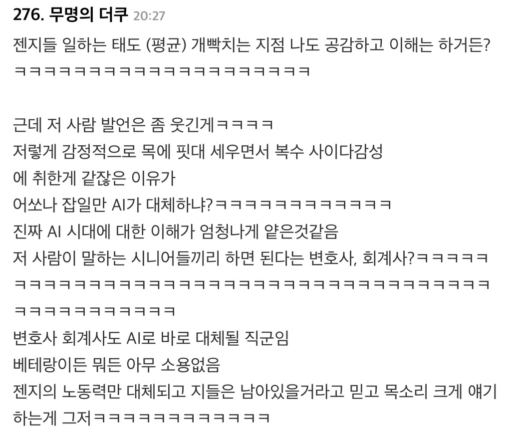 작성자키캡 작성시간 26.03.02 ㅋㅋ.. 경험도 옛말이지 그냥 정치질,친목질로 버텨온 사람을 너무 많이봄. 빠른 도태ㄱ
