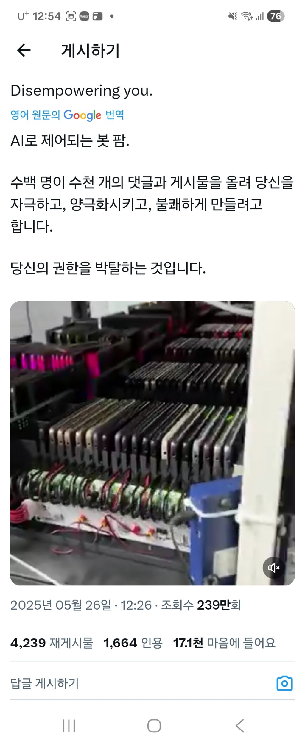 작성자해피럭키리치 작성시간 26.02.27 트위터가 ㄹㅇ 무서워 뭔가 말투 학습을 잘 해놔서 진짜 뭐라고 의견을 말한 거 같은데 읽어보면 어...? 됨 ㅠ