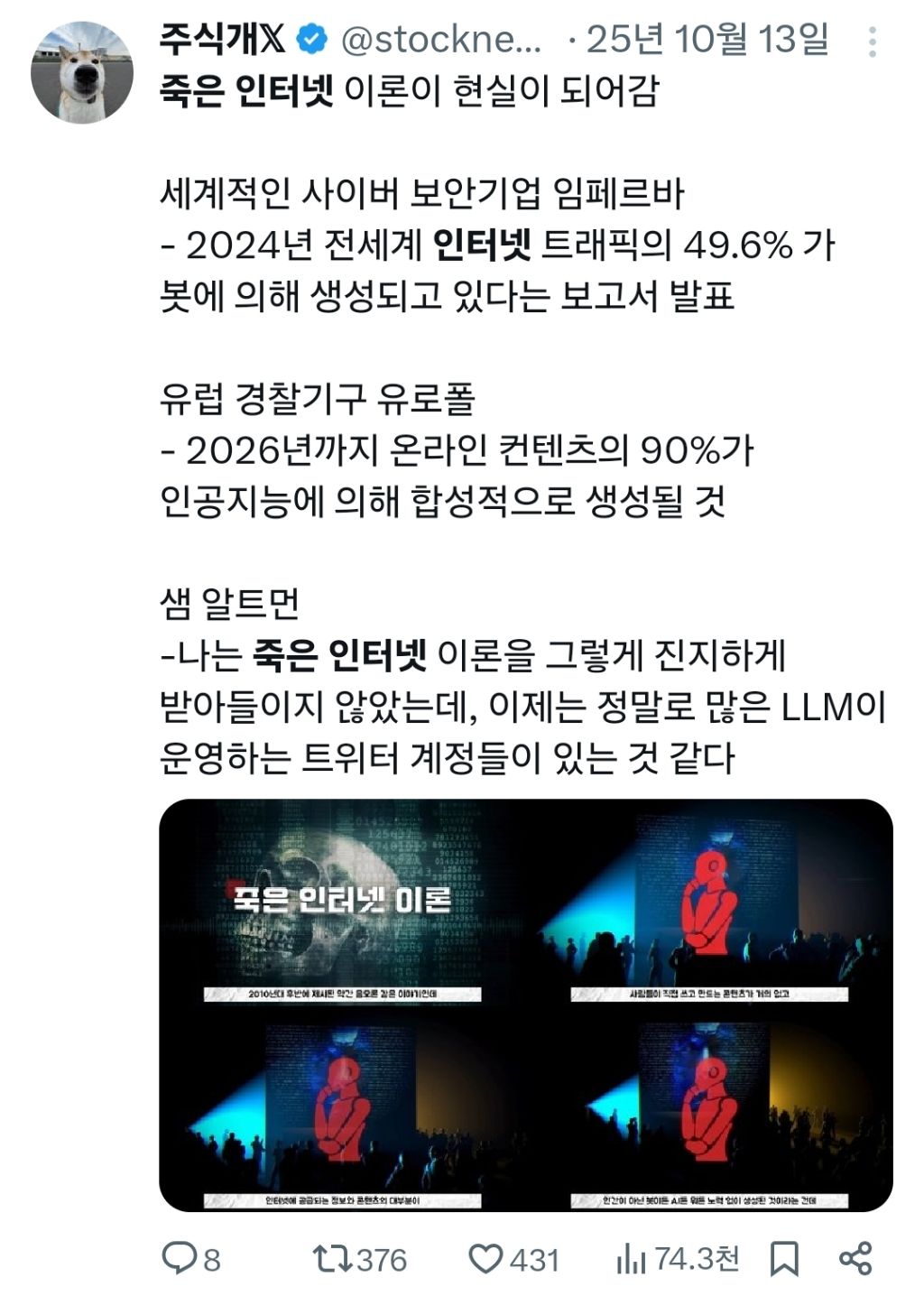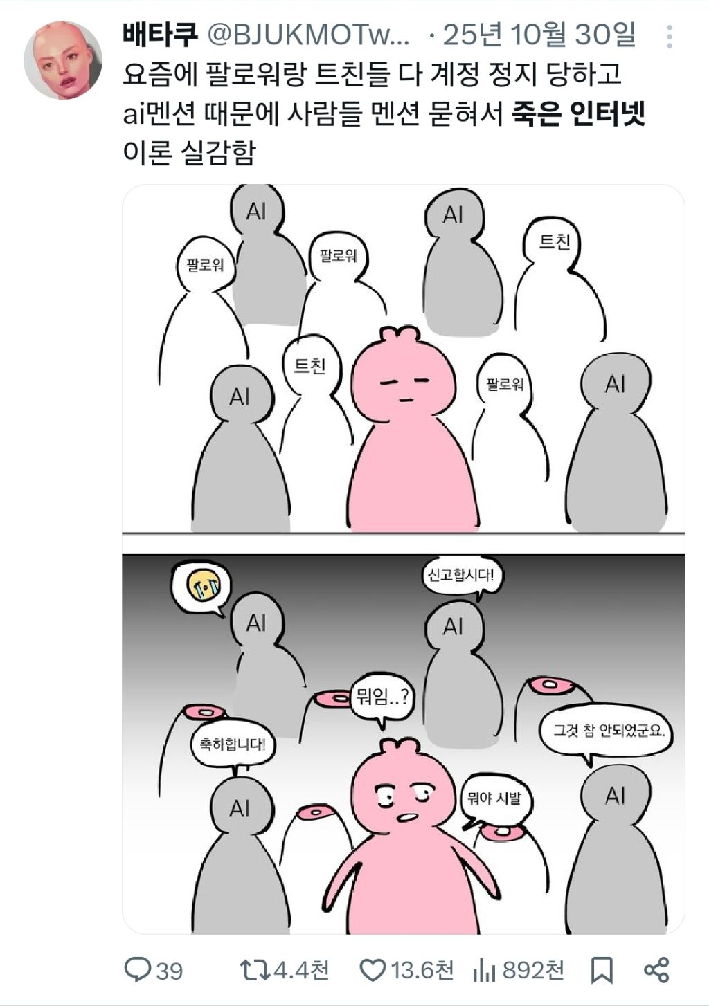 작성자톺아 작성시간 26.02.27 ㄹㅇ오랜만에 트위터 들어갔다가 죄다 AI멘션이라 놀랐어 뭐야 이새끼들