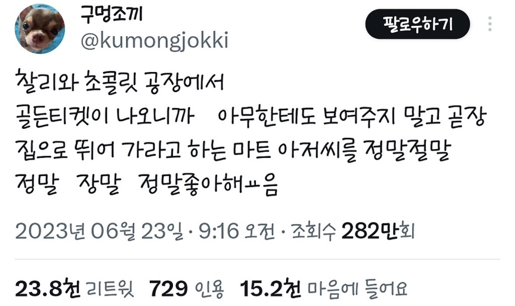 [흥미돋]찰리와 초콜릿 공장에서 골든티켓이 나오니까 아무한테도 보여주지 말고 곧장 집으로 뛰어 가라고 하는 마트 아저씨를 정말 좋아했음.jpg 작성자왜용??|작성시간26.02.27|조회수15,617 목록 댓글 15 글자크기 작게가 글자크기 크게가 출처: https://x.com/kumongjokki/status/1672035798622023680?s=46X의 구멍조끼님(@kumongjokki)찰리와 초콜릿 공장에서 골든티켓이 나오니까 아무한테도 보여주지 말고 곧장 집으로 뛰어 가라고 하는 마트 아저씨를 정말절말 정말 장말 정말좋아해ㅛ음x.com 다음검색 현재 게시글 추가 기능 열기 북마크 공유하기 신고 센터로 신고 댓글 댓글 15 댓글쓰기 답글쓰기 댓글 리스트 작성자파니니팡 | 작성시간 26.02.27 저 아줌마까지도 ㅇㅈ임 저 자전거 할배가 ㄹㅇ 노양심 작성자Leisure | 작성시간 26.02.27 ㅠㅠ 작성자dkwkaaks | 작성시간 26.02.27 나도 뭔가 위그든씨 결의 찐어른 느낌ㅋㅋㅋㅋ 작성자꾁꼬리 | 작성시간 26.02.27 나도 이 장면 좋아해 이게 참된 어른이지 작성자초코초코촠 | 작성시간 26.02.27 맞아ㅠㅠㅠㅠㅠㅠㅠㅠ나도 젛아했어 댓글 전체보기