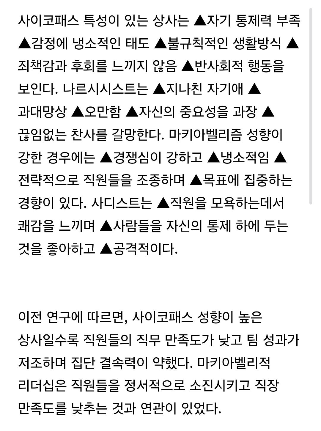 [여시뉴스데스크]팀장이 ‘사이코패스’인지 확실히 아는 방법 작성자이제는|작성시간26.02.27|조회수9,580 목록 댓글 4 글자크기 작게가 글자크기 크게가 출처: https://m.health.chosun.com/svc/news_view.html?contid=2026022503864팀장이 ‘사이코패스’인지 확실히 아는 방법 - 헬스조선직장 상사가 부정적인 성격 특성을 지녔는지 확인하는 분석 방법이 나왔다.스페인 사라고사대 엘레나 페르난데스-델-리오 박사가 직장 상사의 특성과 다크 테트라드 간 연관성을 분석했다....m.health.chosun.com 다음검색 현재 게시글 추가 기능 열기 북마크 공유하기 신고 센터로 신고 댓글 댓글 4 댓글쓰기 답글쓰기 댓글 리스트 작성자WonderwaII | 작성시간 26.02.27 와맞네하나같잌ㅋㅋㅋㅋ와...우리회사에 싸패가이렇게많앗다니^^... 작성자Late better than never | 작성시간 26.02.27 아 우리팀장한테 보여주고싶다 ㅠ 작성자질병관리청장 | 작성시간 26.02.27 팀 성과 저조 이게 과학임 작성자its36ubdo | 작성시간 26.02.28 그는 마키아밸리즘이었군...ㅎ... 결과값도 맞네.... 댓글 전체보기