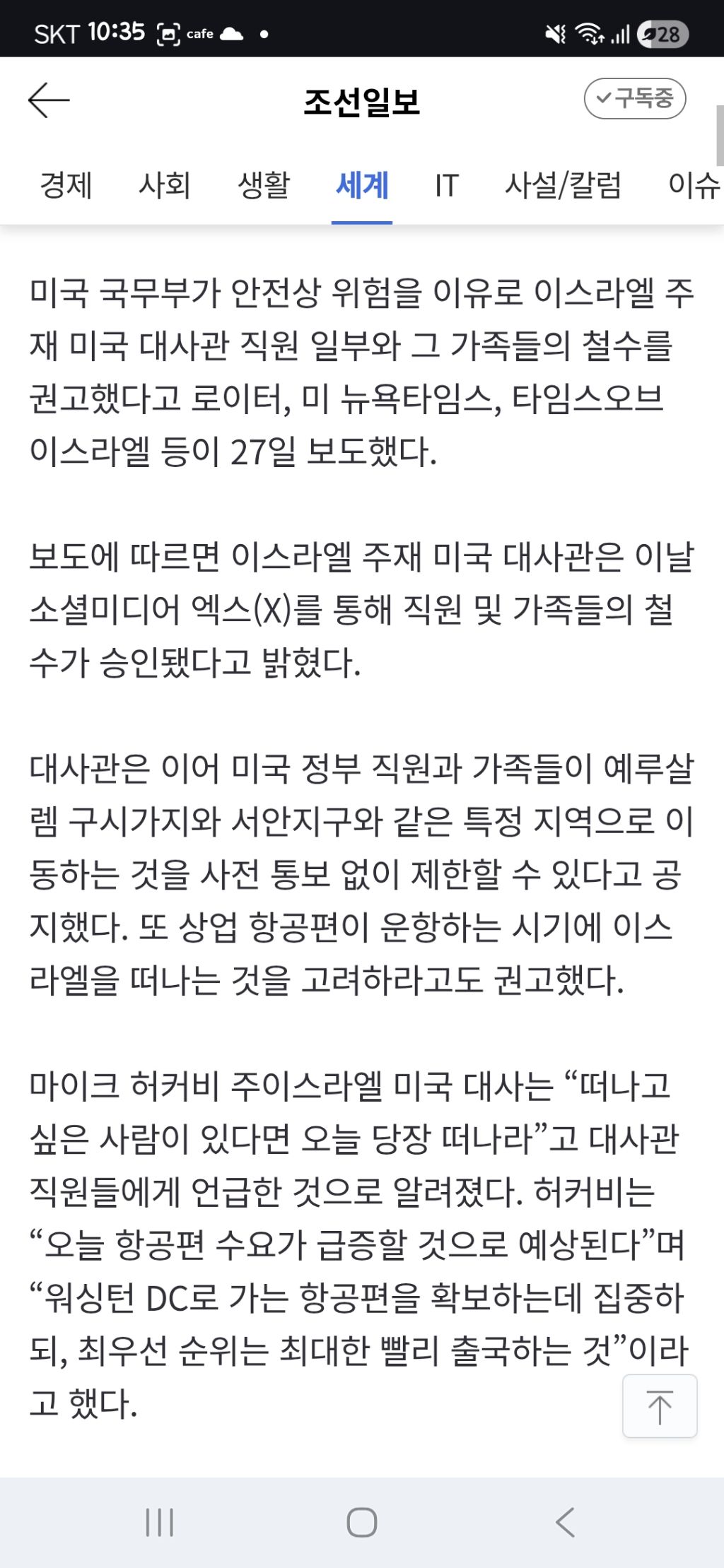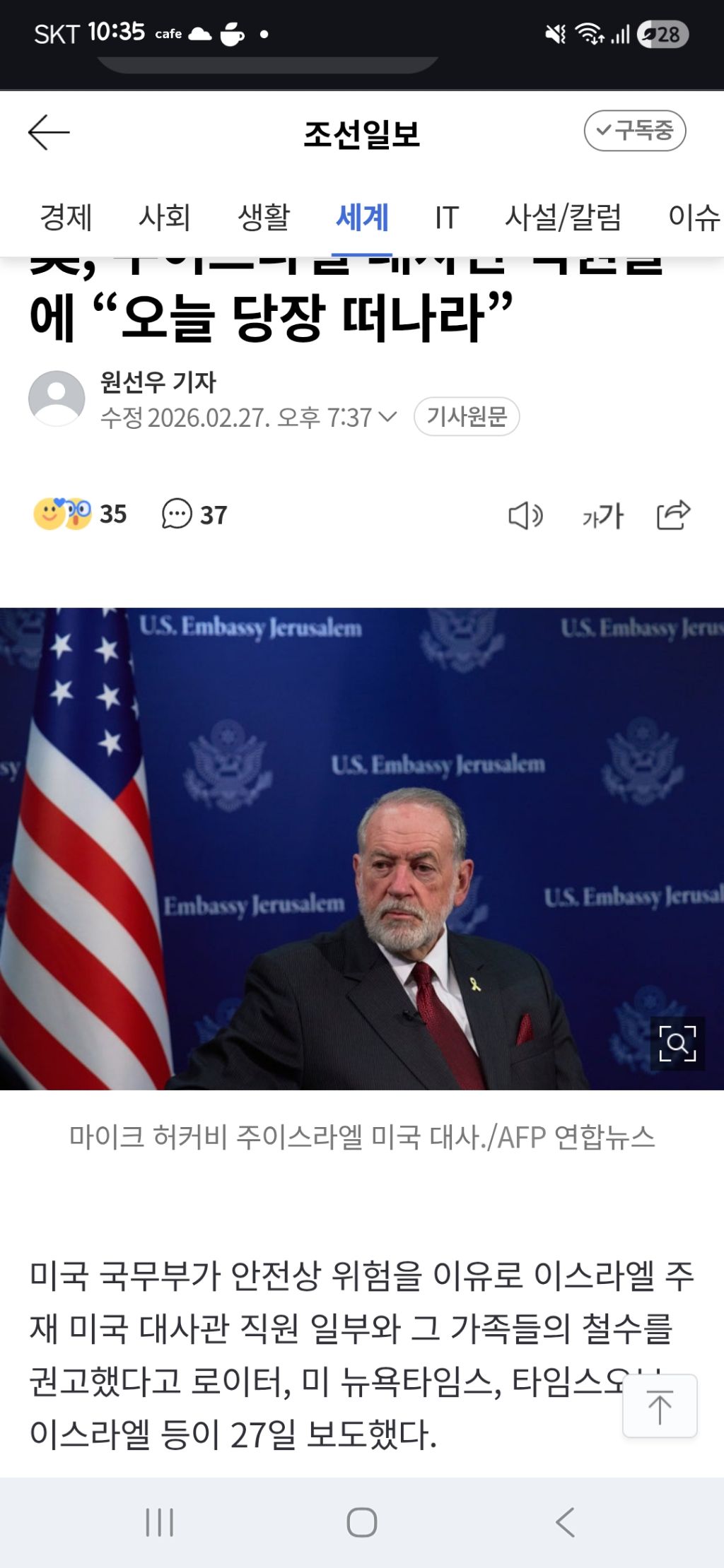 [여시뉴스데스크]美, 주이스라엘 대사관 직원들에 “오늘 당장 떠나라” 작성자다이루어지리다|작성시간26.02.27|조회수6,182 목록 댓글 13 글자크기 작게가 글자크기 크게가 출처: https://naver.me/FHON08MW美, 주이스라엘 대사관 직원들에 “오늘 당장 떠나라”미국 국무부가 안전상 위험을 이유로 이스라엘 주재 미국 대사관 직원 일부와 그 가족들의 철수를 권고했다고 로이터, 미 뉴욕타임스, 타임스오브 이스라엘 등이 27일 보도했다. 보도에 따르면 n.news.naver.com전문출처지구 니네만쓰냐? 미친넘들아 다음검색 현재 게시글 추가 기능 열기 북마크 공유하기 신고 센터로 신고 댓글 댓글 13 댓글쓰기 답글쓰기 댓글 리스트 작성자동원냥반 | 작성시간 26.02.27 나대지마~!~!~!!!! 작성자리치구마 | 작성시간 26.02.27 아 하지말라고!!!! 작성자알본 | 작성시간 26.02.27 아 미친ㅠ 작성자튜튜튜 | 작성시간 26.02.28 싸우지마... ㅜㅜㅠ 작성자올오사러스페인가거싳음 | 작성시간 26.02.28 으 샤갈 댓글 전체보기