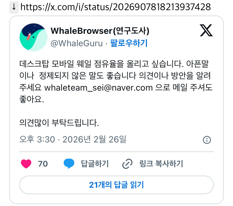 [흥미돋]데스크탑 모바일 웨일 점유율을 올리고 싶습니다 작성자어쩌라고우짜라고으쯔라고|작성시간26.02.27|조회수47,200 목록 댓글 264 글자크기 작게가 글자크기 크게가 출처:https://theqoo.net/square/4109366360나같은 경우 웨일 쓰면 잔오류가 많이 남...그래도 편해서 쓰고있긴 한데 다음검색 현재 게시글 추가 기능 열기 북마크 공유하기 신고 센터로 신고 댓글 댓글 264 댓글쓰기 답글쓰기 댓글 리스트 작성자키캡 | 작성시간 26.03.02 웨일 너무 무거움 리소스 왤케 잡아먹어 미친것; 자료찾고 이것저것 하느라 탭 여러개 켜놓는 타입인데 많이 못켜서 스크랩북 써야함.. 작성자NICK WANG | 작성시간 26.03.02 월루 투명창 여시할때 필수 작성자4949552 | 작성시간 26.03.02 제스쳐 개편해,, 작성자디프레스트힐아일랜드 | 작성시간 26.03.03 ㅈㄴ 편해 제스쳐 최고 작성자2026년엔 행운이 | 작성시간 26.03.03 월루 모바일 최곤디 댓글 전체보기