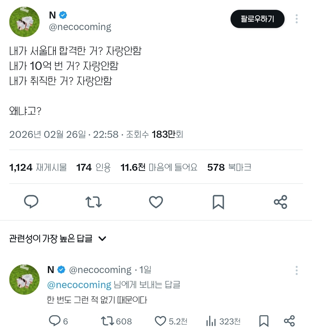 [흥미돋]서울대 합격도, 10억 수익도, 취직한것도 굳이 자랑하지 않는 이유 작성자카이지|작성시간26.02.28|조회수97,683 목록 댓글 36 글자크기 작게가 글자크기 크게가 출처: https://x.com/i/status/2027020524560523423https://x.com/i/status/2027020524560523423 다음검색 현재 게시글 추가 기능 열기 북마크 공유하기 신고 센터로 신고 댓글 댓글 36 댓글쓰기 답글쓰기 댓글 리스트 답댓글 작성자올리고당원 | 작성시간 26.02.28 ㅋㅋㅋㅋㅋㅋㅋㅋㅋㅋ 작성자빠꾸와꾹 | 작성시간 26.02.28 사람이 겸손해야하긴 함 작성자가니디 | 작성시간 26.02.28 현명하시네... 작성자아응애예요엉엉 | 작성시간 26.02.28 그래서 나도 200억 기부한거 자랑안하잖아 작성자공정하다는착각 | 작성시간 26.02.28 아 ㅋㅋㅋㅋㅋㅋㅋㅋ 존나 개쳐웃겨 댓글 전체보기