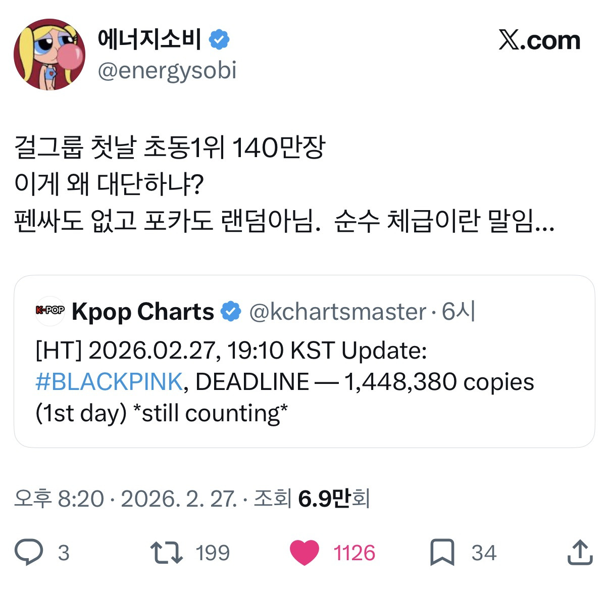 [흥미돋]블랙핑크 이번 앨범 판매량이 역대급인 이유 작성자nero|작성시간26.02.28|조회수57,242 목록 댓글 66 글자크기 작게가 글자크기 크게가 출처: https://x.com/energysobi/status/2027343170288390246?s=46X의 에너지소비님(@energysobi)걸그룹 첫날 초동1위 140만장 이게 왜 대단하냐? 펜싸도 없고 포카도 랜덤아님. 순수 체급이란 말임...x.com요즘같은 상술시대에 랜덤 포카도 아니고 팬싸도 없이 순수 체급으로 첫날 140만장 팔아버림,, 다음검색 현재 게시글 추가 기능 열기 북마크 공유하기 신고 센터로 신고 댓글 댓글 66 댓글쓰기 답글쓰기 댓글 리스트 작성자따봉고슴도치의 습격 | 작성시간 26.02.28 개지려 진심 작성자어떡게이름도팜하니 | 작성시간 26.02.28 그 회사처럼 상술0 순수 체급.. 작성자지은호 | 작성시간 26.02.28 블핑 지금 앨범인증 스케줄도 없어서.. 진짜 걍 순수체급임 작성자Lechatsauvelemonde | 작성시간 26.02.28 누구누구는 도라버리갣내 ㅋ 작성자인태희 | 작성시간 26.03.01 체급 커져서 안 돌거 같긴 한데.....음방은 좀 돌아주라ㅠㅠㅠ 댓글 전체보기