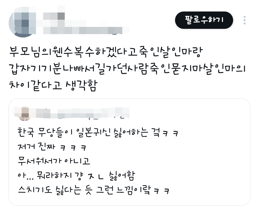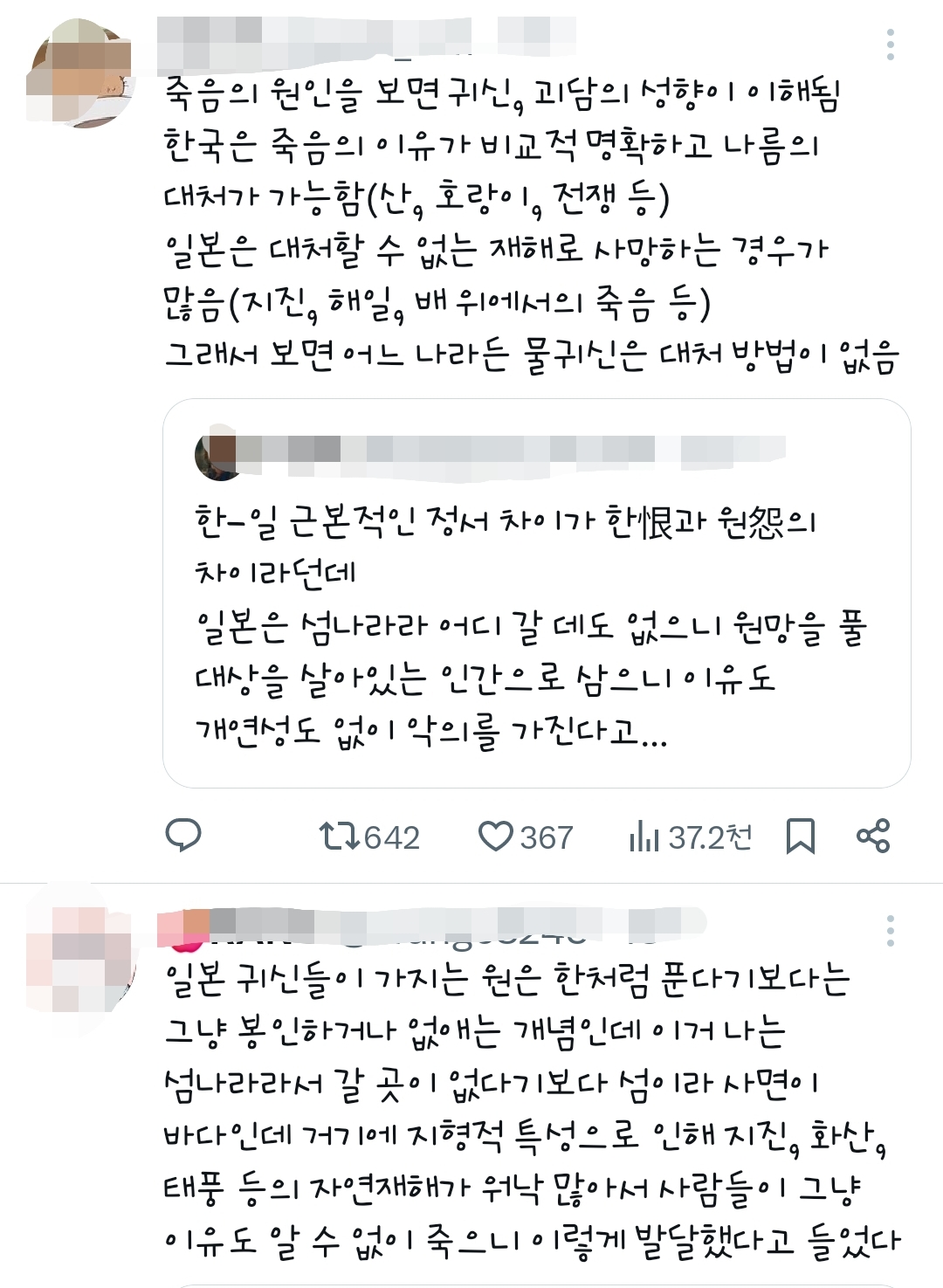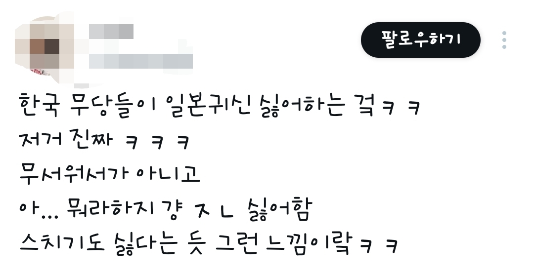[스크랩] [흥미돋]한국 무당들이 일본귀신 싫어하는거...스치기도 싫다는듯 그런 느낌 작성자불로케리|작성시간26.02.28|조회수80,930 목록 댓글 38 글자크기 작게가 글자크기 크게가 출처 : https://theqoo.net/square/3119925739 한국귀신이랑 일본귀신은 진짜 근본부터 다른듯그래서 한국에서는 성불하라고 하고 일본은 봉인한다고 함 다음검색 스크랩 원문 : *여성시대* 차분한 20대들의 알흠다운 공간 현재 게시글 추가 기능 열기 북마크 공유하기 신고 센터로 신고 댓글 댓글 38 댓글쓰기 답글쓰기 댓글 리스트 작성자바나나복숭아 | 작성시간 26.03.01 귀신도 찐따같은 나라 답댓글 작성자알러빗 | 작성시간 26.02.28 아 뻘하게 웃디넼ㅋㅋㅋㅋㅋㅋㅋ 답댓글 작성자과도한 띿놀 | 작성시간 26.02.28 ㅋㅋㅋㅋㅋㅋㅋㅋㅋㅋㅋㅋㅋㅋㅋㅋㅋㅋ 답댓글 작성자원하는건다가지는걸 | 작성시간 26.03.03 앜ㅋㅋㅋㅋㅋㅋㅌㅌ 작성자정지안 | 작성시간 26.02.28 약간 똥같은 거지 무서워서 피한다기보다 더러워서 피하는 느낌 ㅡㅡ 댓글 전체보기
