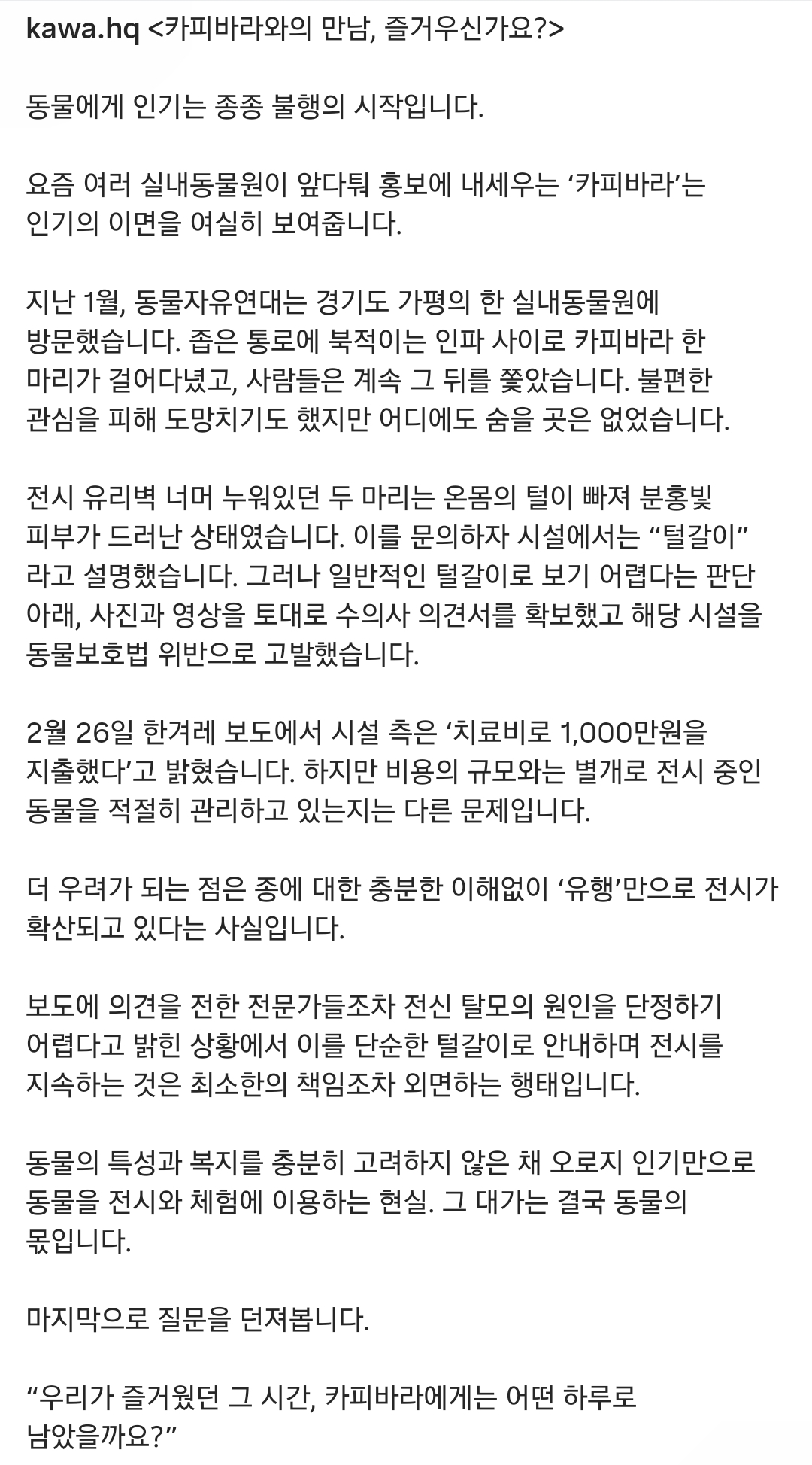 작성자워라밸매니아 작성시간 26.02.28 롯데월드몰도 카피바라 들어왔던데.. 그만 동물 좀 괴롭혀라