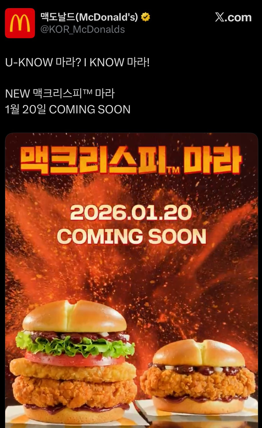 [스크랩] [흥미돋]맥도날드 맥크리스피 마라 1/20 출시 작성자Salt and Light|작성시간26.02.28|조회수2,706 목록 댓글 7 글자크기 작게가 글자크기 크게가 출처: https://x.com/kor_mcdonalds/status/2011356171341595118?s=46광고 뜨길래 캡쳐해옴 다음검색 스크랩 원문 : *여성시대* 차분한 20대들의 알흠다운 공간 현재 게시글 추가 기능 열기 북마크 공유하기 신고 센터로 신고 댓글 댓글 7 댓글쓰기 답글쓰기 댓글 리스트 작성자치와와러뷰 | 작성시간 26.02.28 마라맛이 나긴나 근데맛없어 작성자소울트리 | 작성시간 26.02.28 개노맛 작성자라일라보일러 | 작성시간 26.02.28 임원 한명이 아재에 꽂혔나 작성자클하 | 작성시간 26.02.28 무슨 맛일지 안 먹어도 알 것 같음 얼얼한데 엄청 짤듯 작성자짱순 | 작성시간 26.02.28 별로엿어 댓글 전체보기