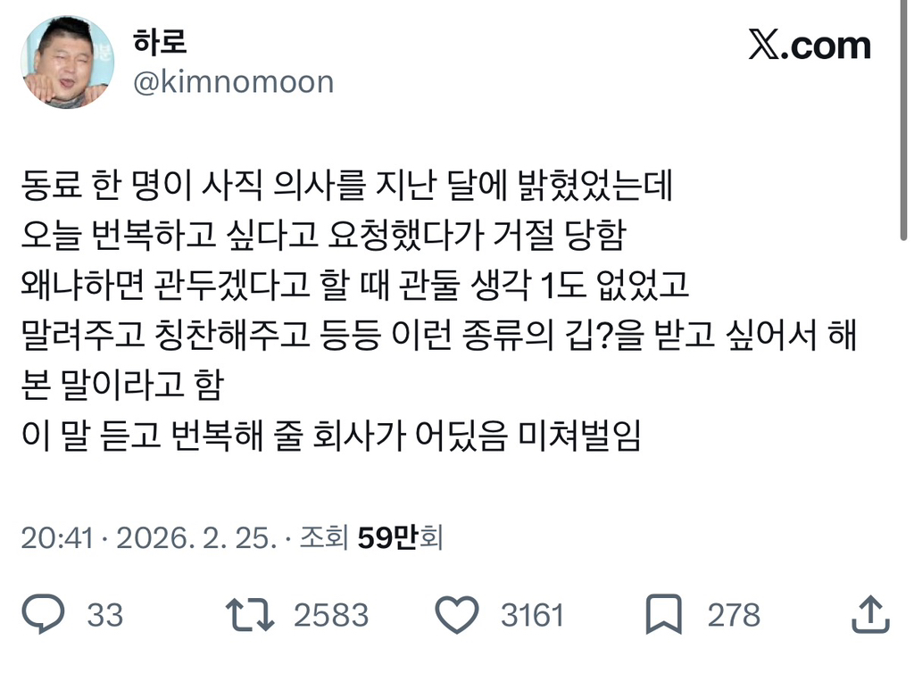 [스크랩] [흥미돋]퇴사 번복 합니다 저는 단지 ㅇㅇ 하고 싶었을 뿐 작성자악성민원감당은내가언제까지해여|작성시간26.02.28|조회수68,118 목록 댓글 46 글자크기 작게가 글자크기 크게가 출처: https://theqoo.net/square/4107619865https://x.com/kimnomoon/status/2026623465282023682?s=20깁을 받고 싶어서 퇴사 선언 다음검색 스크랩 원문 : *여성시대* 차분한 20대들의 알흠다운 공간 현재 게시글 추가 기능 열기 북마크 공유하기 신고 센터로 신고 댓글 댓글 46 댓글쓰기 답글쓰기 댓글 리스트 작성자사이사이사이사이 | 작성시간 26.02.28 우리회사 신입도 그랬음 ㅋㅋㅋㅋㅋㅋㅋㅋㅋㅋ 작성자앙버터소금빵 | 작성시간 26.02.28 개폐급이라 아무도 상대 안해주나보다ㅋㅋㅋ 맨날 인력부족하단 소리 들으니까 지가 나가면 잡을줄알았나봄.. 니 자르고 알바뽑는게 이득이다… 작성자쿄냥이 | 작성시간 26.02.28 …? 작성자Amoroso | 작성시간 26.03.02 지랄을ㅋㅋㅋㅋㅋㅋㅋㅋㅋㅋㅋ 답댓글 작성자Amoroso | 작성시간 26.03.02 너 뭐 됨? 댓글 전체보기