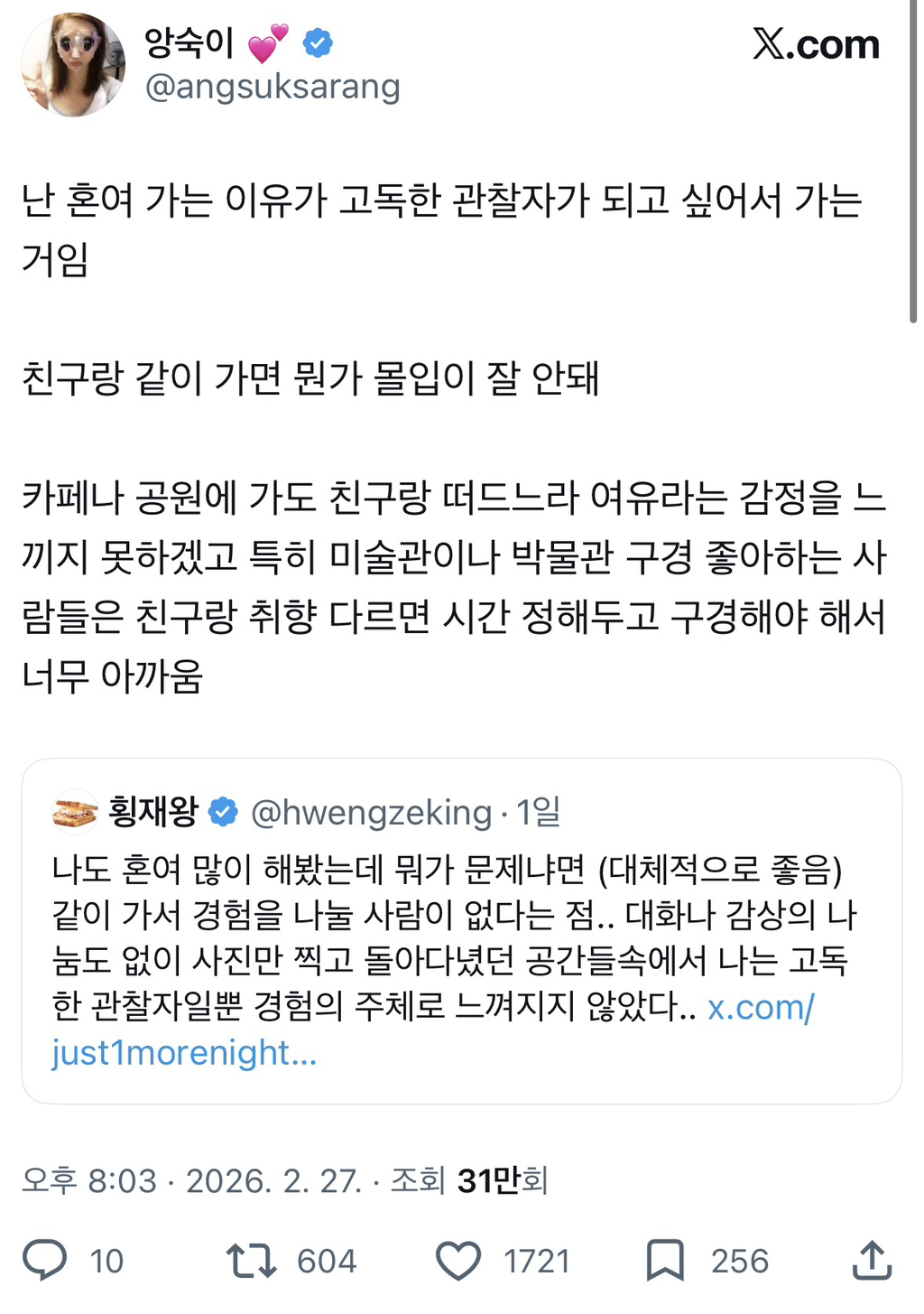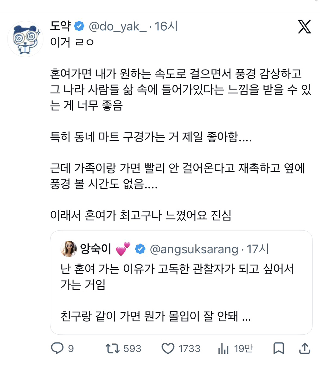 작성자lateCheckout 작성시간 26.03.01 ㄹㅇ 혼여가야 온전히 여행지를 즐기는 느낌... 여러명가면 그냥 즐거운 친목다지기 모임임 그건 그거대로 매력있지만 둘은 진짜 다름
