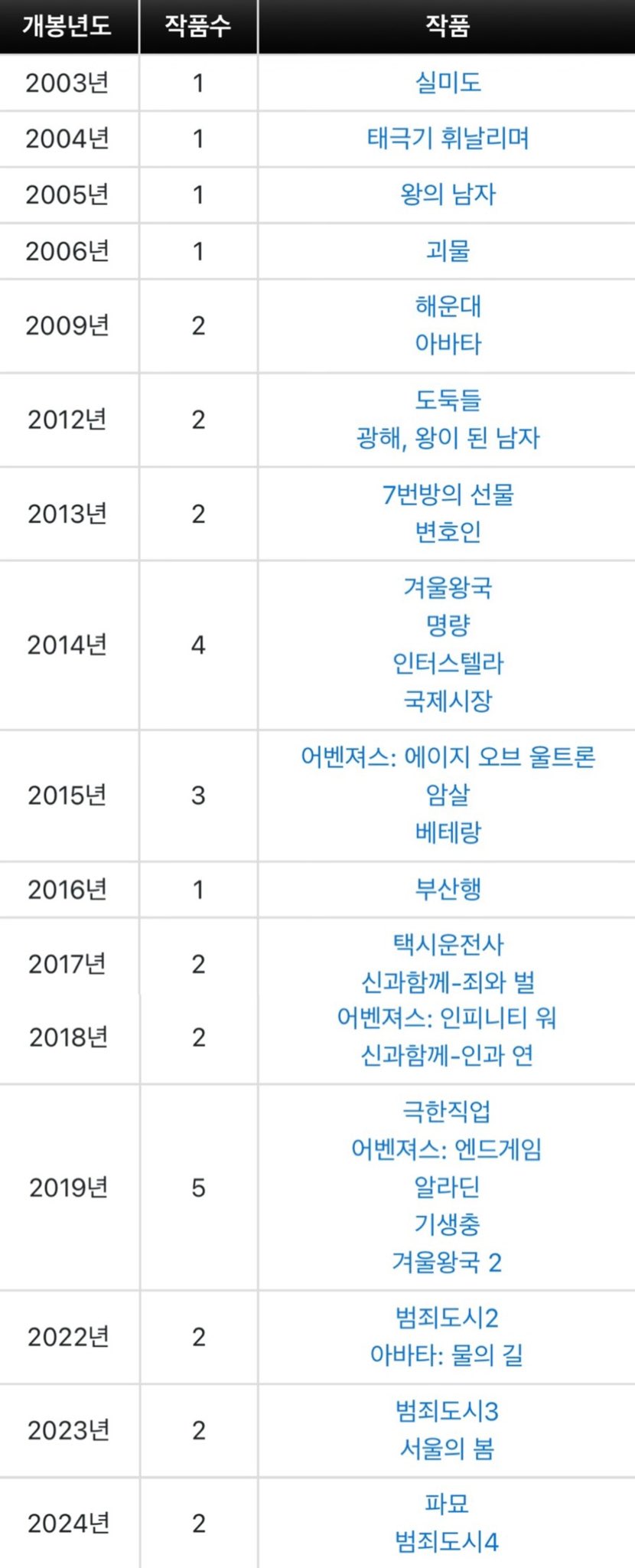 [흥미돋]역대 천만 영화 리스트.list 작성자whitepencil|작성시간26.02.28|조회수12,731 목록 댓글 61 글자크기 작게가 글자크기 크게가 출처: 여성시대 whitepencil지금까지 총 33편여시들이 본 천만 영화는 모두 몇 개야?? 다음검색 현재 게시글 추가 기능 열기 북마크 공유하기 신고 센터로 신고 댓글 댓글 61 댓글쓰기 답글쓰기 댓글 리스트 작성자2026돈아껴서주식사기 | 작성시간 26.02.28 27개 작성자발산 | 작성시간 26.02.28 17개 작성자순대가 싫어요 | 작성시간 26.02.28 30개 작성자know waves | 작성시간 26.03.01 24 작성자필구리 | 작성시간 26.03.01 26 댓글 전체보기
