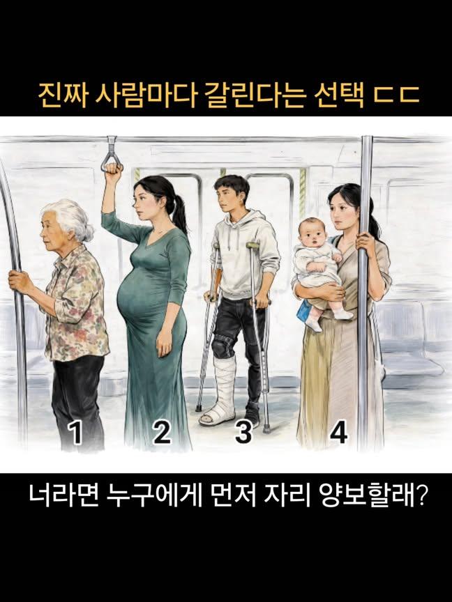 [흥미돋]누구에게 제일 먼저 자리 양보할래? 작성자귀여운덕수|작성시간26.02.28|조회수41,526 목록 댓글 231 글자크기 작게가 글자크기 크게가 출처: https://www.threads.com/@k7060814/post/DVSqrivEofF?xmt=AQF062Xmbq1bbaOjPVmDw01WjVbuVoyVH6evTb3p5o0u3WX8Lj9ZRSnz5giE0PdfaBB-QuLf&slof=1 다음검색 현재 게시글 추가 기능 열기 북마크 공유하기 신고 센터로 신고 댓글 댓글 231 댓글쓰기 답글쓰기 댓글 리스트 작성자카페를떠나줄수있어? | 작성시간 26.03.01 4 아기가 가장 약자잖아 저기서 작성자기묘한징징이 | 작성시간 26.03.01 2143 작성자요리조리보보 | 작성시간 26.03.01 2,4 3은 남자라 안함 작성자-2kg | 작성시간 26.03.01 일단 냄저한텐 안함 작성자sprezztura | 작성시간 26.03.02 4231 댓글 전체보기