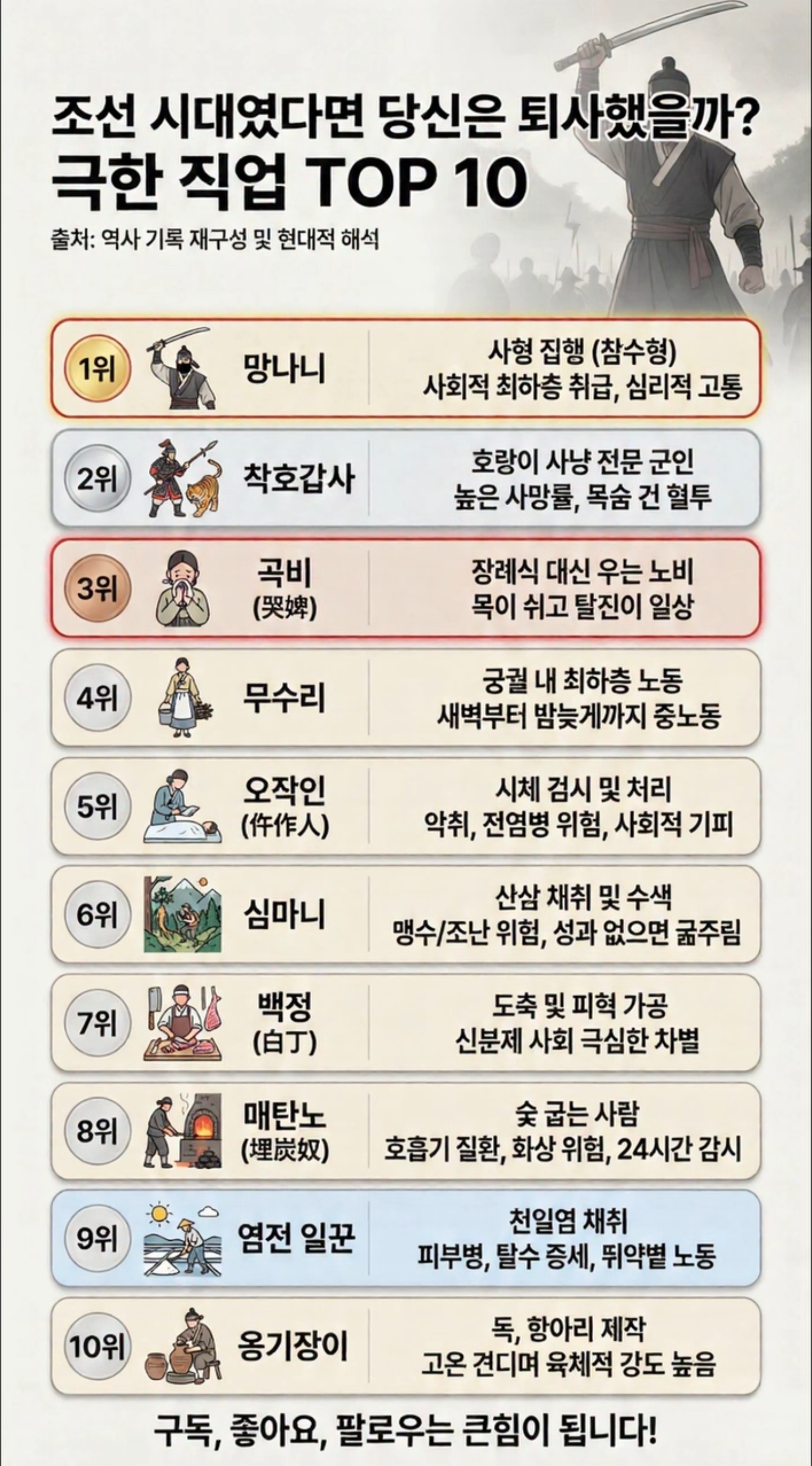 [스크랩] [흥미돋]조선시대 극한 직업 TOP 10 작성자알티드래곤|작성시간26.02.28|조회수11,767 목록 댓글 9 글자크기 작게가 글자크기 크게가 엽기 혹은 진실(세상 모든 즐거움이 모이는곳)출처 : https://www.instagram.com/reel/DUaork1DmOg/?igsh=MWhkNHV4YmlidnUycA== 다음검색 스크랩 원문 : 엽기 혹은 진실 (세상 모든 즐거움이 모이는 곳) 현재 게시글 추가 기능 열기 북마크 공유하기 신고 센터로 신고 댓글 댓글 9 댓글쓰기 답글쓰기 댓글 리스트 작성자로또당첨기원1일차 | 작성시간 26.02.28 숙빈최씨는 대단하네 작성자이킁에킁 | 작성시간 26.02.28 힘들다ㅠ 작성자깁초밥 | 작성시간 26.02.28 매탄노들대부분 폐암 걸렸을 거 같애 작성자제니좋아하는애엄마 | 작성시간 26.03.01 정신노동 육체노동 인권0.. 작성자천상연 미친 정신병자야 널 사랑해 | 작성시간 26.03.03 나 그나마 심마니.. 댓글 전체보기