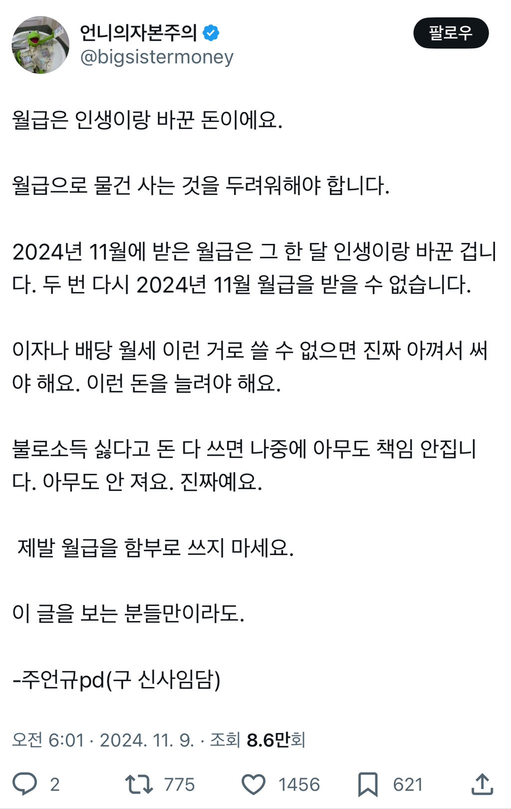 작성자파팟팟 작성시간 26.03.01 하루의절반정도를 출퇴근+근로하면서 보내고 받은돈이라고 생각하니까 최대한 아껴서쓰게되더라 ㅠㅠ 이생활10년정도하니까 돈 쓰는법을 몰라서 그런지 잘안쓰게되고 한달에 딱 정해놓은 금액이상은 안씀