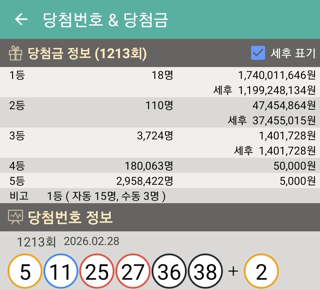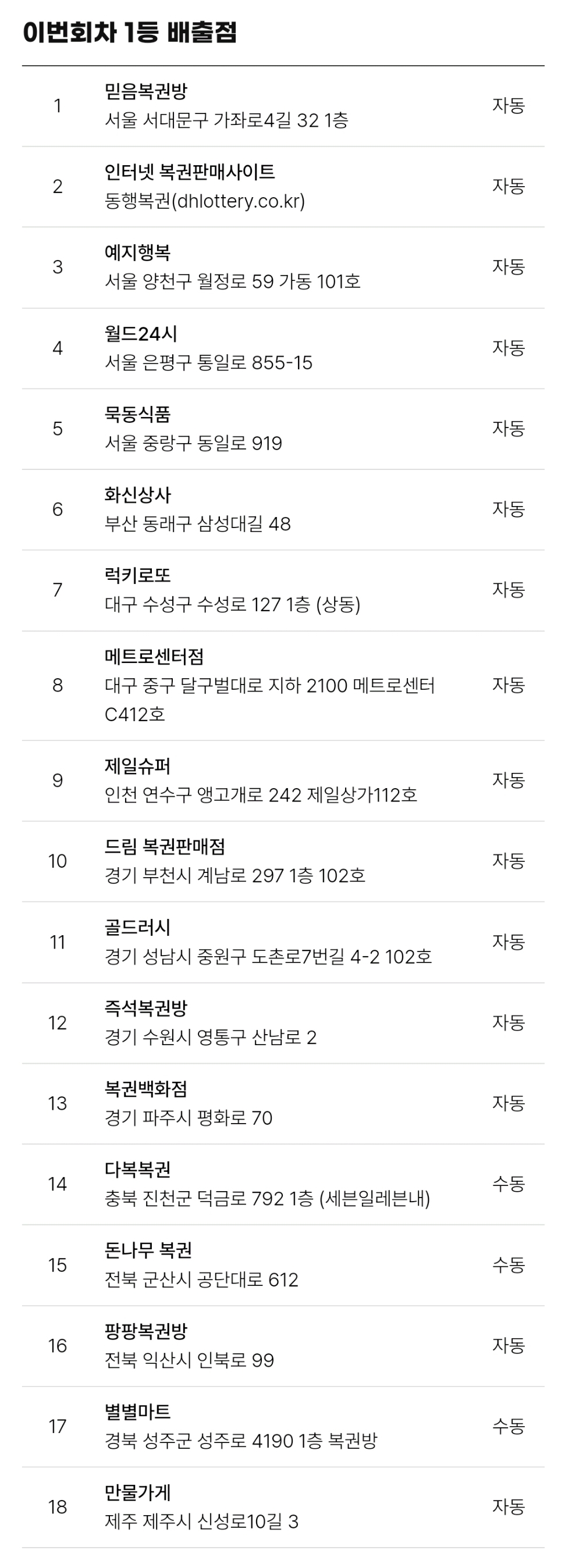 [흥미돋]오늘자 로또 1등 배출점 작성자Mia Goth|작성시간26.02.28|조회수59,608 목록 댓글 155 글자크기 작게가 글자크기 크게가 출처: 여성시대 Mia Goth미방+ 동행복권 2등도 6개 당첨! 다음검색 현재 게시글 추가 기능 열기 북마크 공유하기 신고 센터로 신고 댓글 댓글 155 댓글쓰기 답글쓰기 댓글 리스트 작성자존버기특강쥐 | 작성시간 26.03.01 수동으로 5등 5개 됐다.. 쌰갈 번호 반타작 아까워 작성자설트리 | 작성시간 26.03.01 ㅇ하 ㅠ 작성자인간보다고양이 | 작성시간 26.03.01 동행복권 왜 나 아닌데ㅜ 작성자Xxydo | 작성시간 26.03.01 부럽다 다들... 작성자마니매니모 | 작성시간 26.03.01 우리지역 있네,,,,, 댓글 전체보기