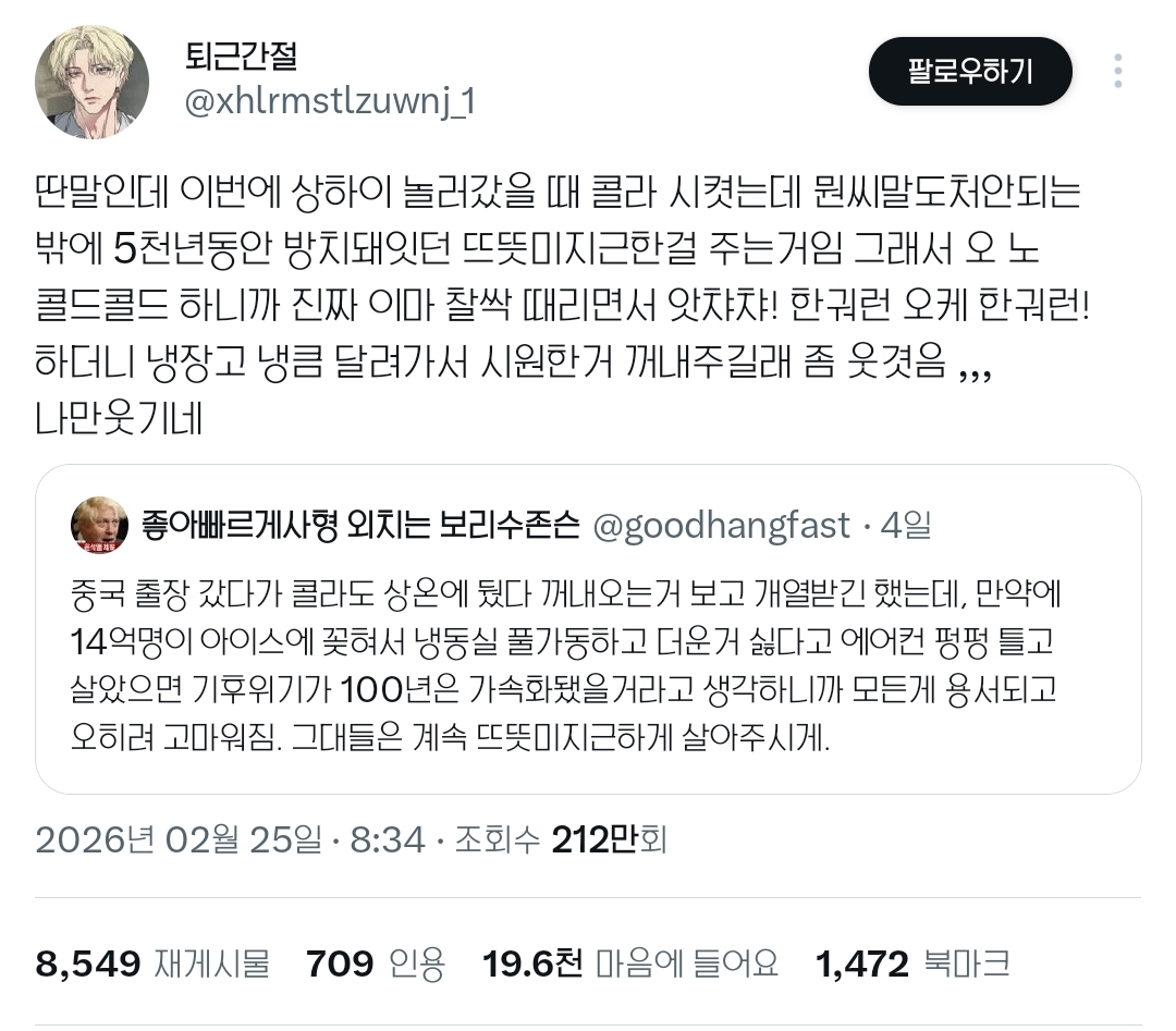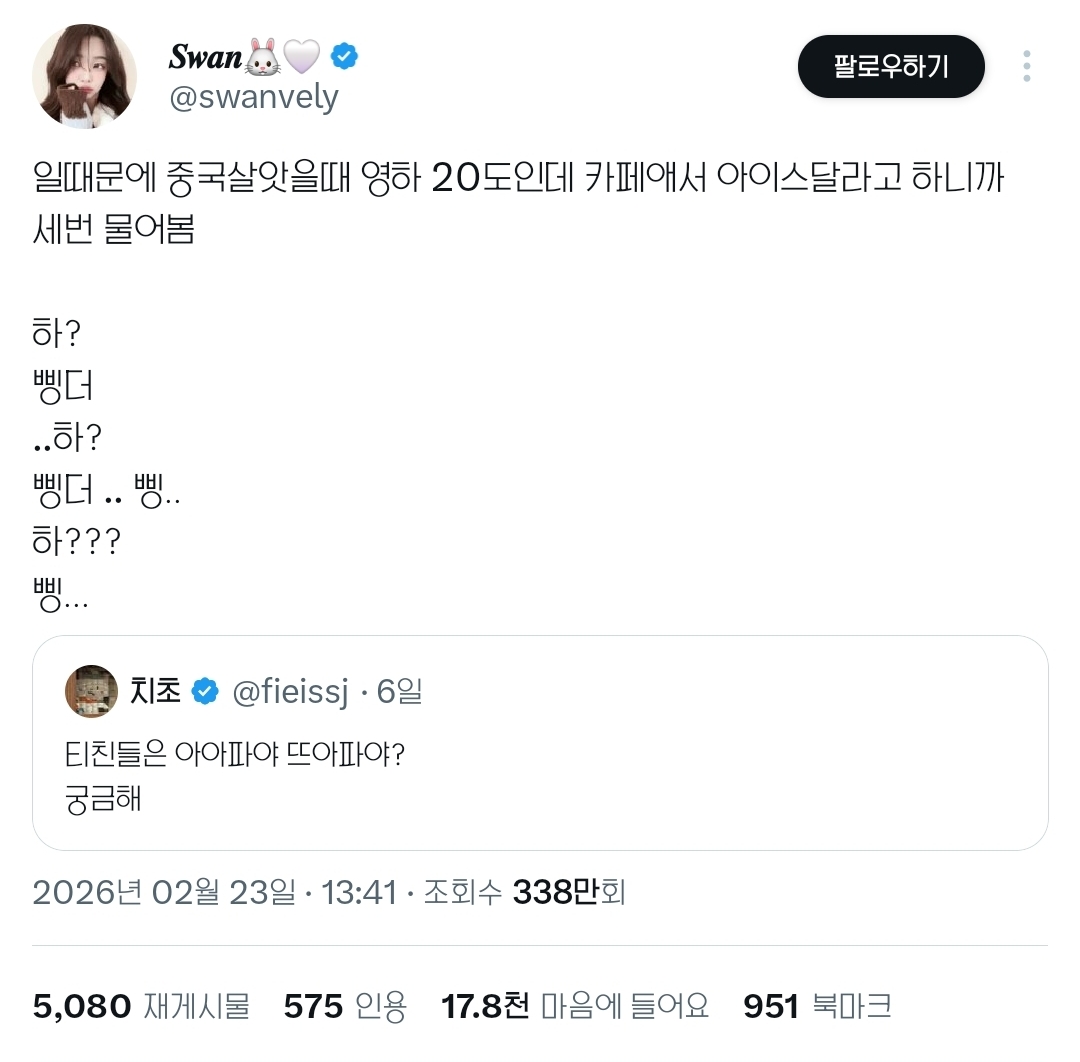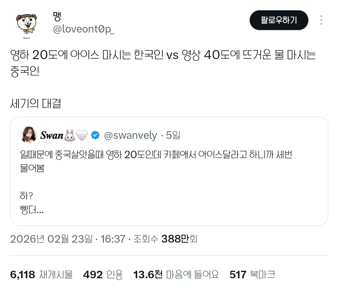 [흥미돋]영하 20도에 아이스 마시는 한국인 vs 영상 40도에 뜨거운 물 마시는 중국인 작성자카이지|작성시간26.02.28|조회수25,364 목록 댓글 20 글자크기 작게가 글자크기 크게가 출처: https://x.com/i/status/2025793191992332726https://x.com/i/status/2025793191992332726* 삥더=冰的=찬거https://x.com/i/status/2025837322789601478https://x.com/i/status/2026245821709369830https://x.com/i/status/2026440687093428423앗챠챠! 한궈런 오케 한궈런! 다음검색 현재 게시글 추가 기능 열기 북마크 공유하기 신고 센터로 신고 댓글 댓글 20 댓글쓰기 답글쓰기 댓글 리스트 작성자팜레스트 | 작성시간 26.02.28 건강에는 좋겠네... 작성자제주바다물고기 | 작성시간 26.02.28 중국 맥주는 좀 화나더라 작성자ㅋㅋㅋㅋㅋㅋㅎㅎㅋ | 작성시간 26.03.01 영상40도에서 뜨거운차..? 미친…. 광기 ㄹㅈㄷ 어케 먹어 그걸 안 덥나..? 작성자쿠우쿠우화장실문지기 | 작성시간 26.03.01 이야 니네도 진짜 지독하다 작성자développé | 작성시간 26.03.01 앗차차 한궈런ㅋㅋㅋㅋㅋㅋ 댓글 전체보기