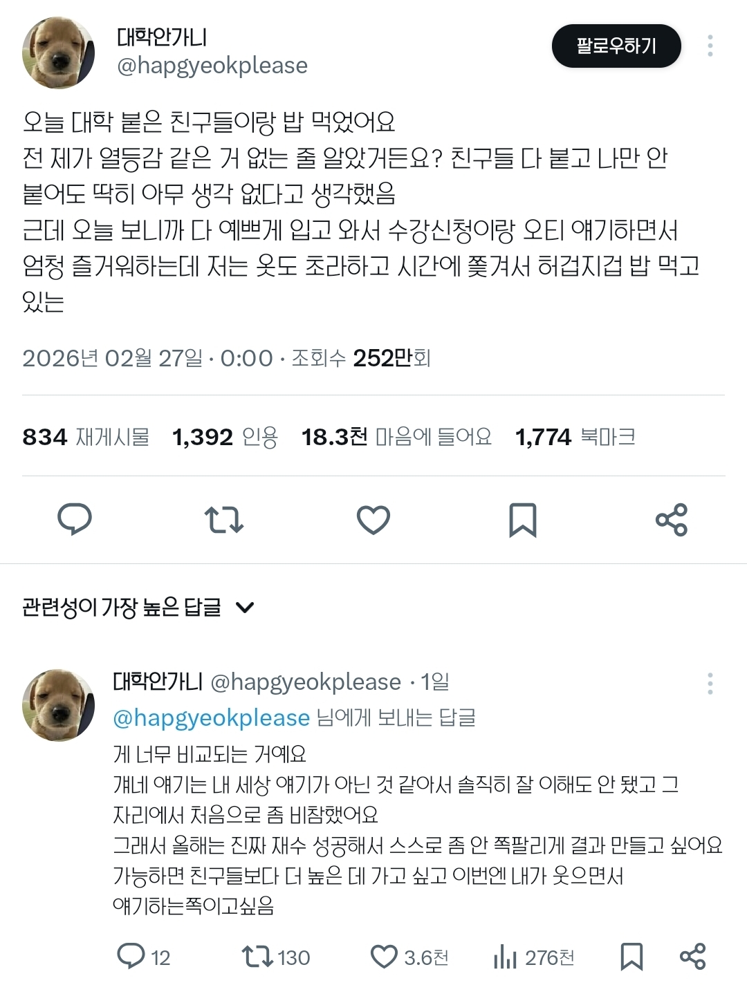 작성자초록색좋아좋아 작성시간 26.03.01 꼭 저 상황이 아니더라도 본인이 멘탈 깨질거 같음 거리둬야함. 장기취준생인 친구 만날때 처음엔 배려차 아예 회사 이야기 안꺼내지만 내 삶인데..점점 말에 섞여서 나오더라고. 원 글쓴이처럼 긍정적으로 발산하던가 힘들면 안만나면 그만.