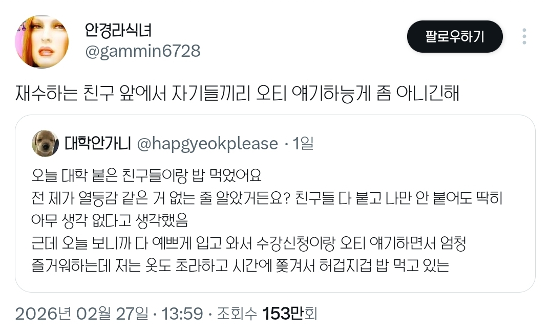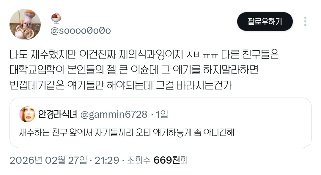 작성자초고수 작성시간 26.03.01 인용에 대한 생각은.. 저런거 배려하다보면 오히려 저 한 친구 빼고 단톡생김....
